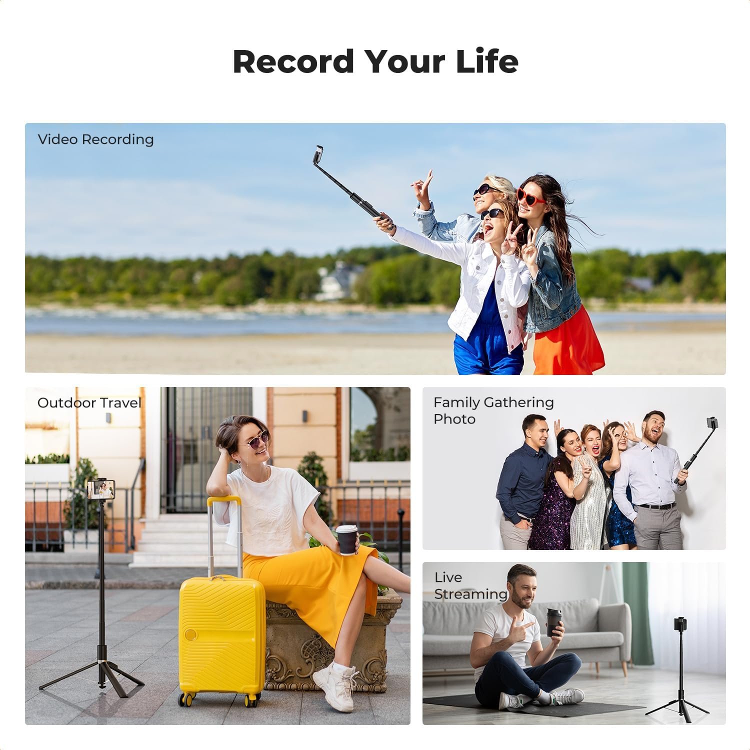 Stable & Portable: This phone tripod stand features an aluminum alloy tripod. When buttom fully extended, the tripod spans 17in/43cm, providing stable support. The height can be adjusted from 14in/34cm to 69 in/175cm, supporting wide-angle shooting. This selfie stick for Android is only 0.8lb(376g), which is easily fitting into a handbag, plus added textured design to prevent slipping, making it a perfect companion for outings, hiking or urban exploration.