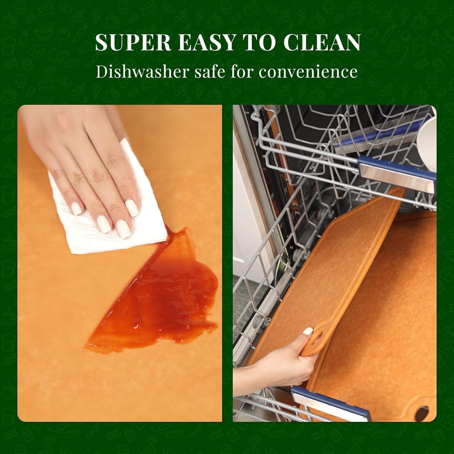【Easy to Clean】Thanks to a high-heat compression process, Kikcoin kitchen cutting board is also dishwasher safe and non-porous. For optimal lifespan, please hand wash with mild dish soap, warm water, and a soft sponge or cloth