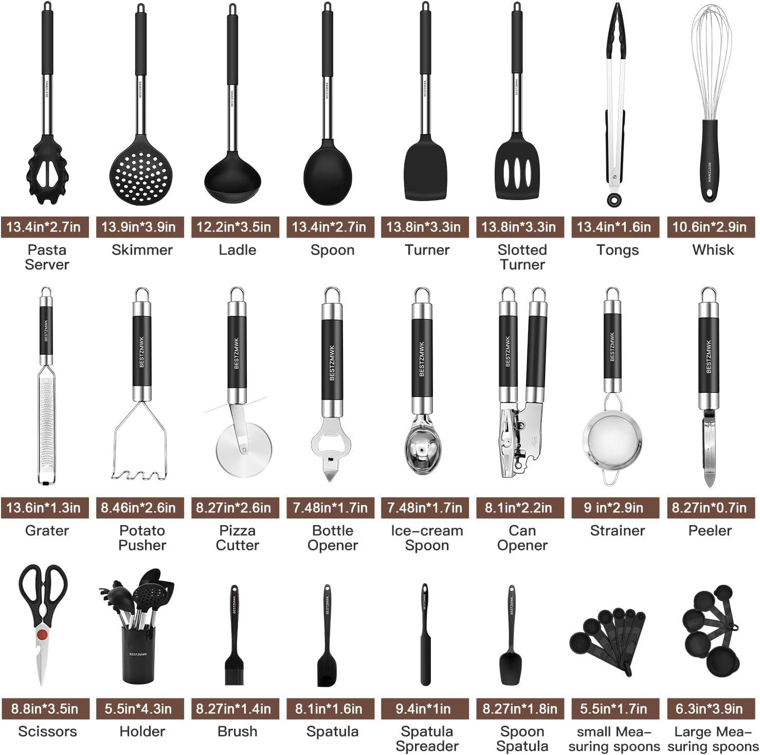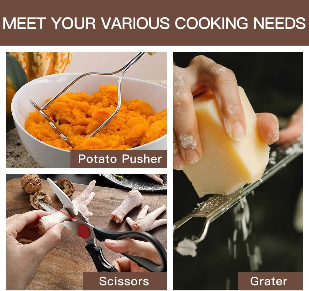32 COOKING UTENSILS – Utensil Set includes everything you need to cook that perfect dish,includes Turner,Slotted turner,Skimmer,Spoon,Ladle,Pasta server,Tongs,Whisk,Spatula spreader,Spoon spatula,Large and samll Measuring spoons,Holder,Brush,Spatula,Grater,Strainer,Scissors,Potato pusher,Can opener,Bottle opener,Pizza cutter,Ice-cream spoon
