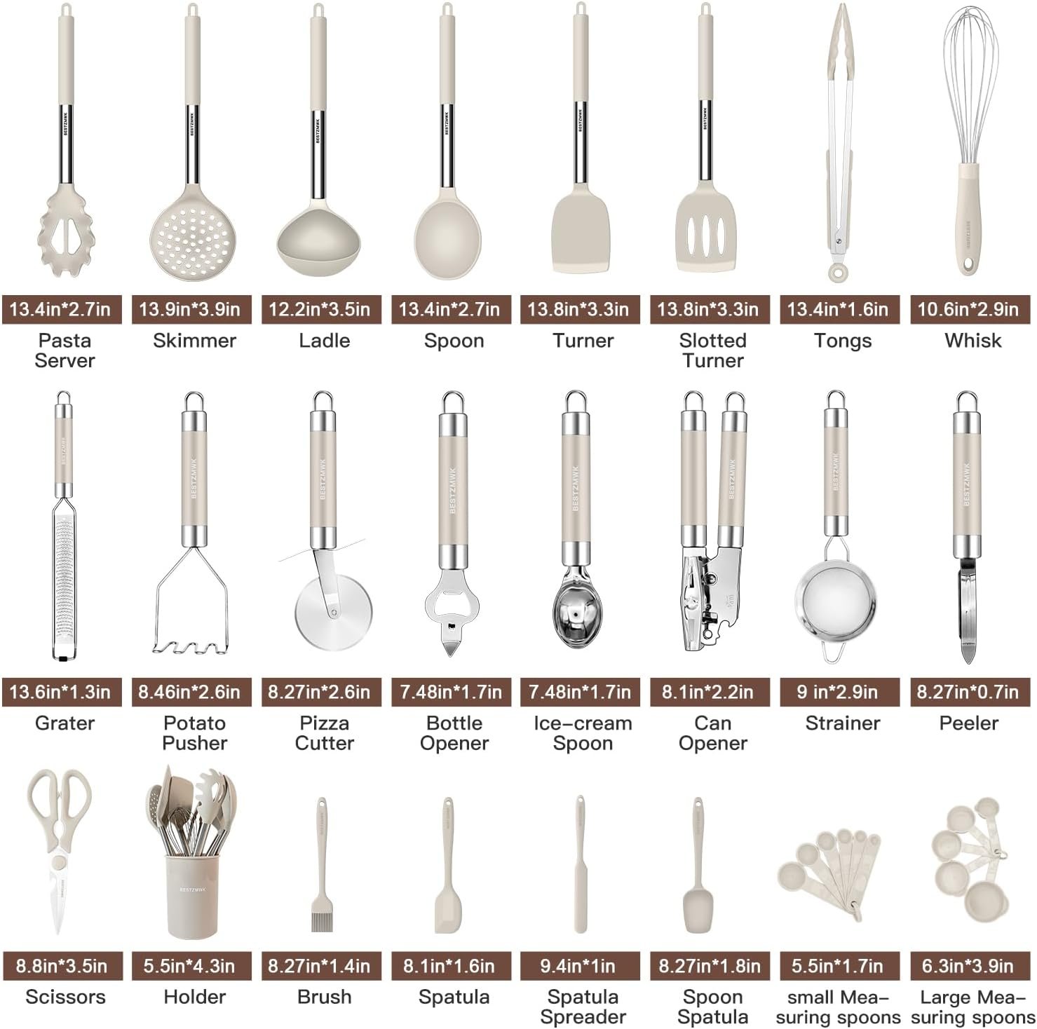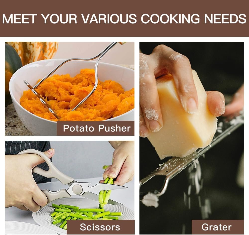 33 COOKING UTENSILS – Utensil Set includes everything you need to cook that perfect dish,includes Turner,Slotted turner,Skimmer,Spoon,Ladle,Pasta server,Tongs,Whisk,Spatula spreader,Spoon spatula,Large and samll Measuring spoons,Holder,Brush,Spatula,Grater,Strainer,Scissors,Potato pusher,Can opener,Bottle opener,Pizza cutter,Ice-cream spoon