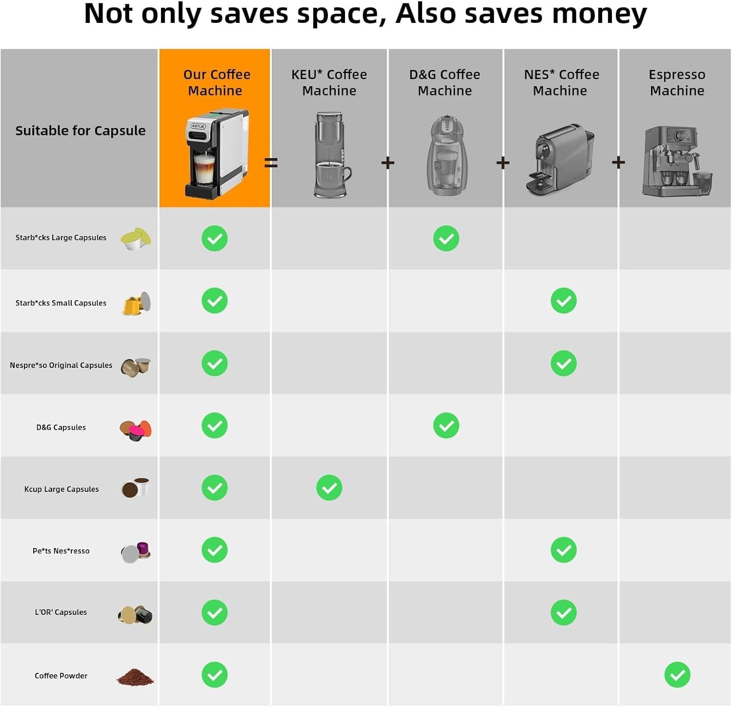 Suitable: Compatible with Ne*presso Original, LO*R Original,D*lce Gust*, K*Cup and ground coffee