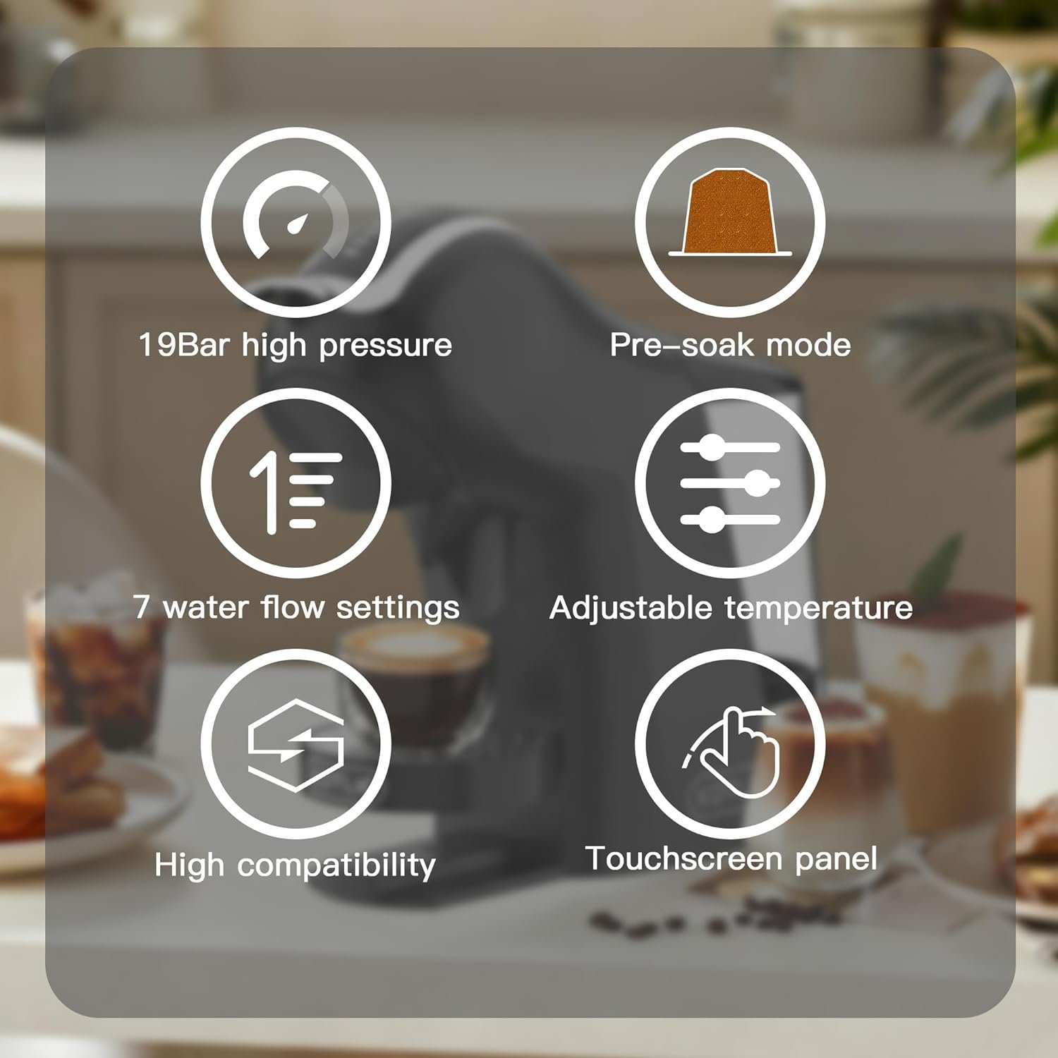 Compatible: K*cup capsules/Nespres*o Original/LO*R Original/Dol*e Gust*/Ground Coffee