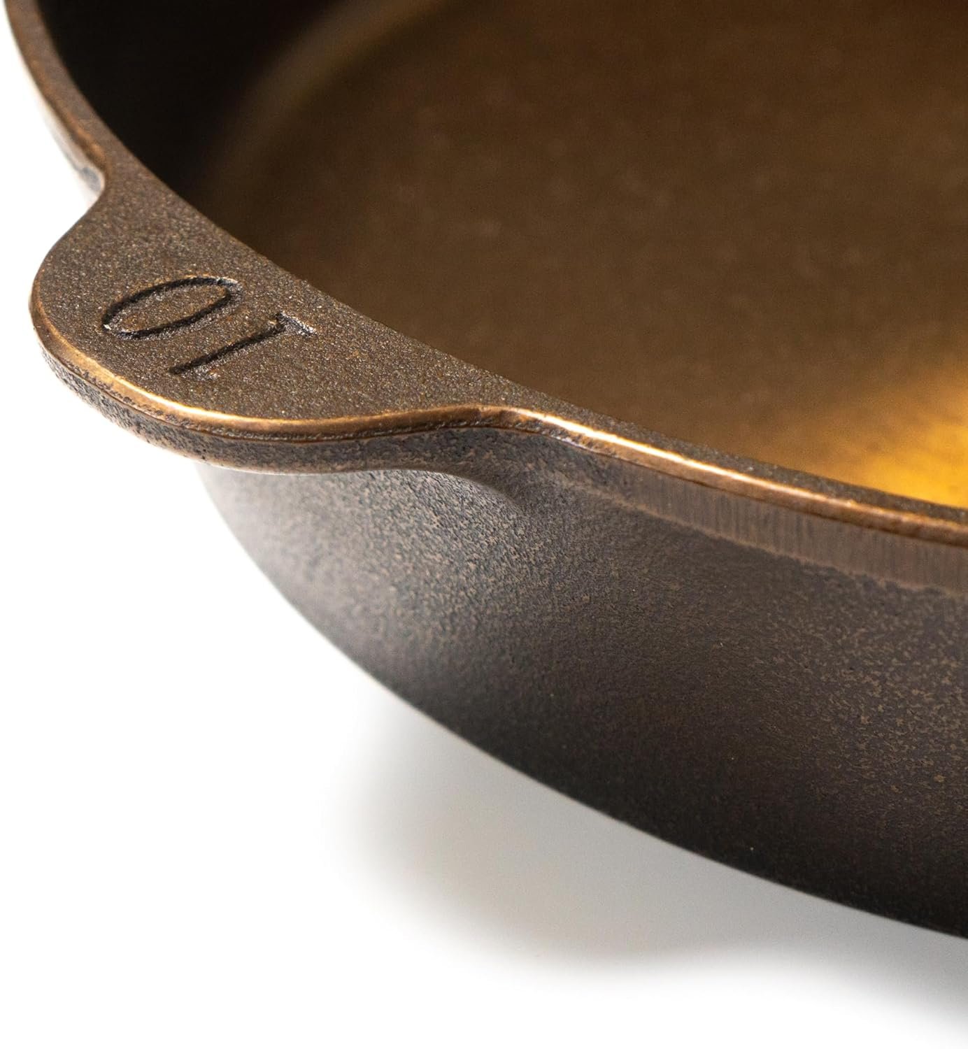 Made in America: Cast, machined, and pre-seasoned in Pennsylvania. The Lancaster No. 10 is our “main course skillet” and is ready to use right out of the box. It has an 11-5/8 inch diameter and a depth of 2 1/8 inches.