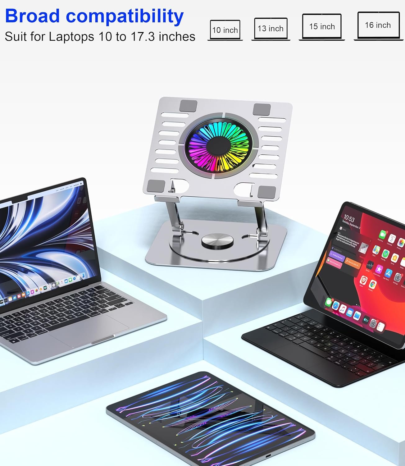 Laptop Stand,with 360°Rotating Base,External Cooling Fan,Adjustable RGB Lighting,Ergonomic Foldable Notebook Computer Holder.Compatible with All 10-17″ Laptops Tablets,Silver