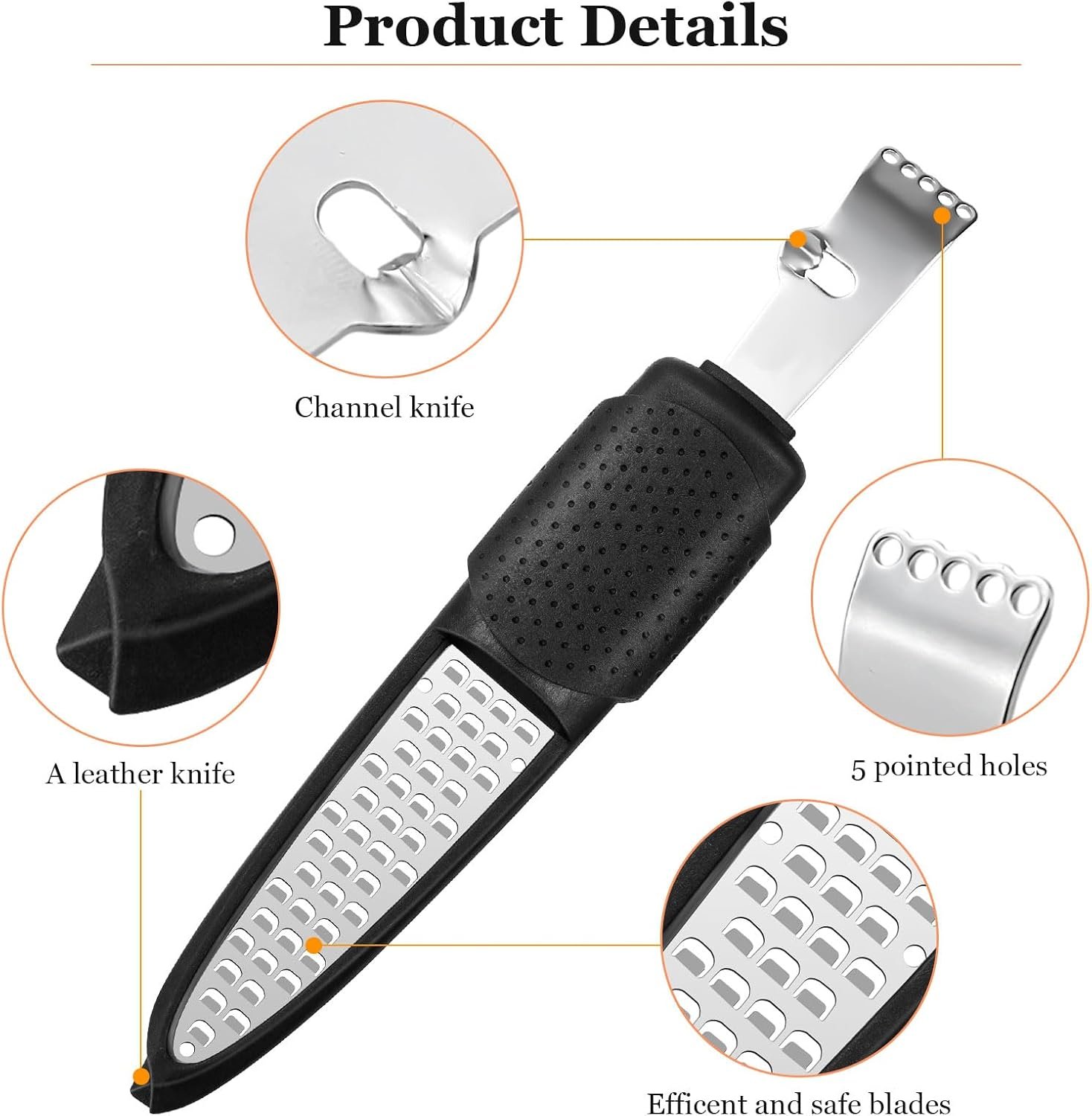 【2025 New 4-in-1 Versatility】Our Lemon Zester is perfect for creating citrus zest and garnishes. It features five ultra-sharp zester holes that effortlessly peel citrus fruits, along with a specially designed channel knife for easy peeling. Achieve professional-level results in your kitchen.