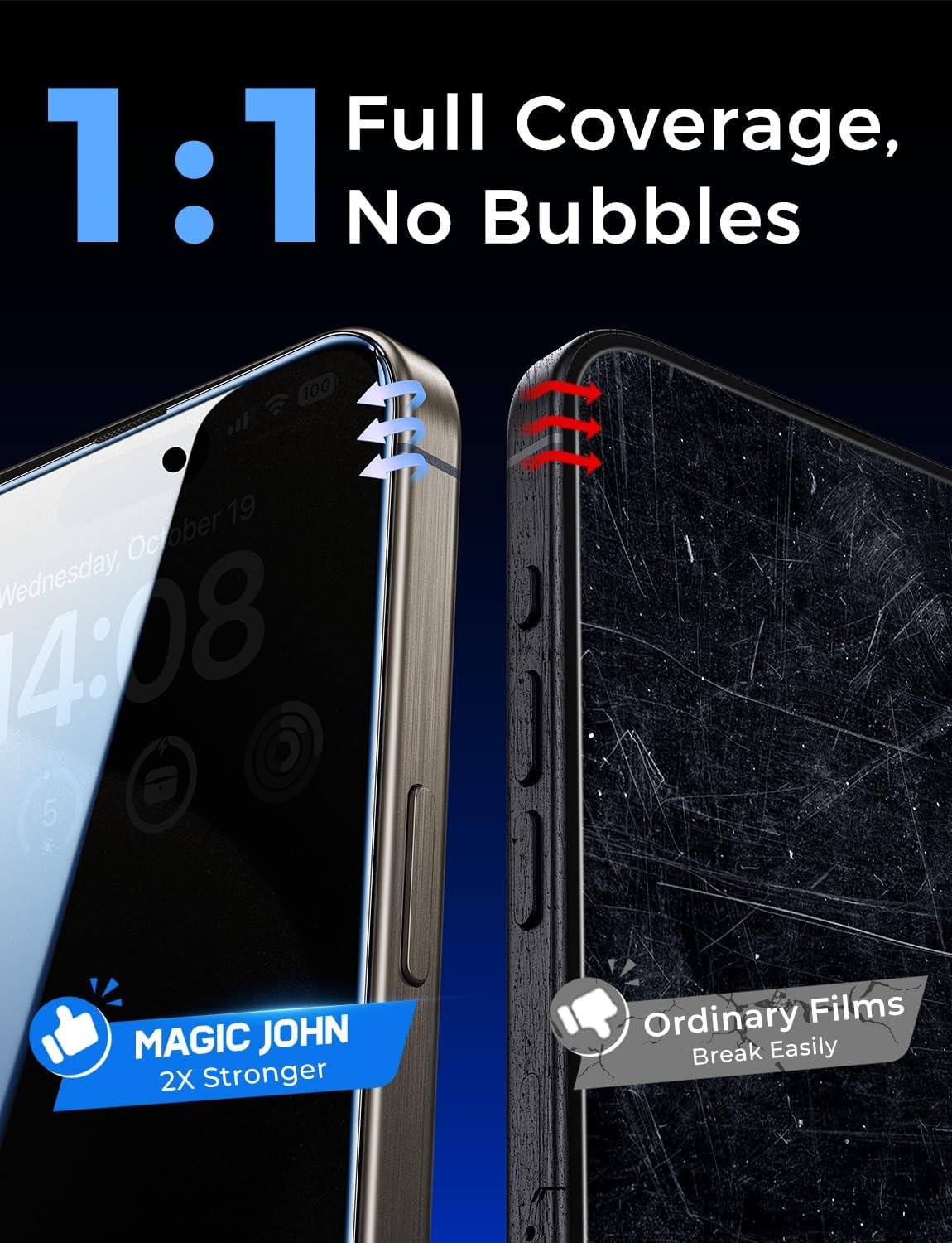 [Anti-Fingerprint] MAGIC JOHN privacy glass screen protector for iPhone 15 Pro Max 6.7 inch is finished with oleophobic coating to against oil residue from fingerprints from long-term use.