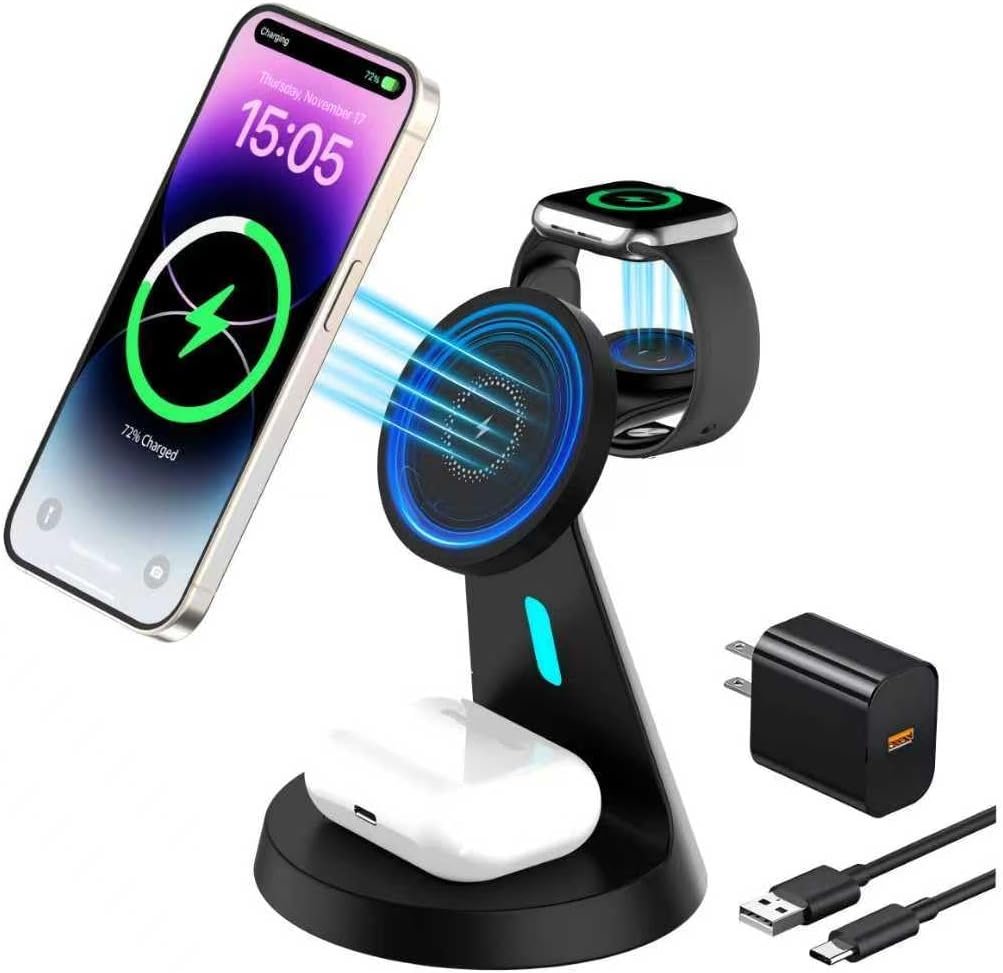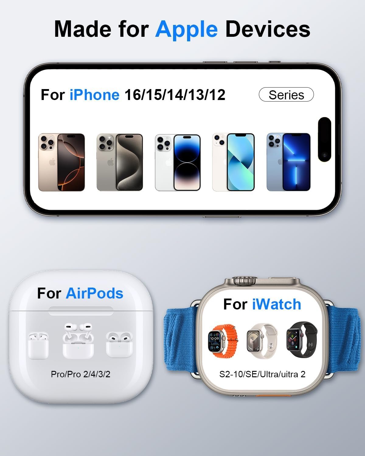 3 in 1 Charging Station for Apple:Combines fast charging for phones, watches, and erabuds in one sleek device; Compatible with iPhone 12–16 series (iPhone 8–11 requires a magnetic case); Apple Watch 10/9/8/7/6/4/3/2/SE/Ultra/Ultra 2; AirPods 2/3/4/Pro/Pro 2