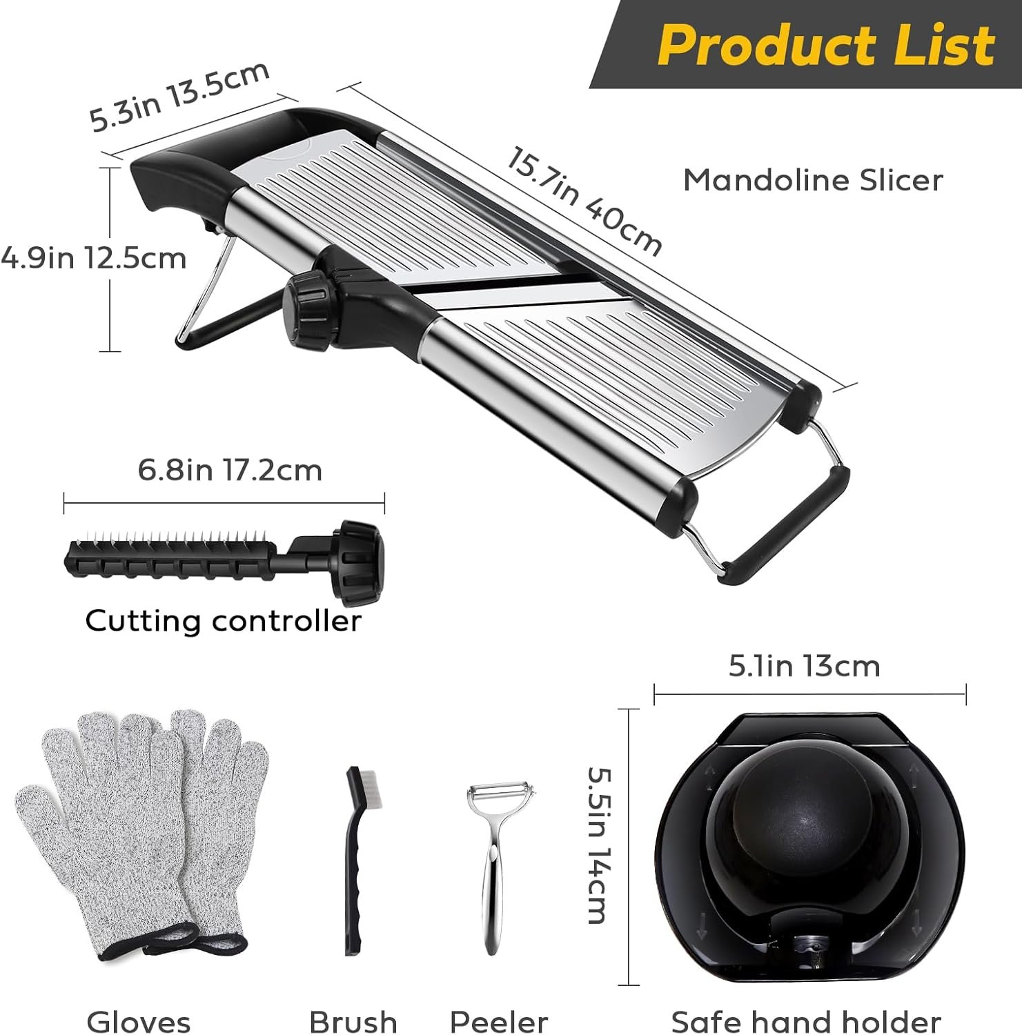 Mandoline slicer, Stainless Steel adjustable Mandoline vegetable slicer, mandoline for kitchen, Vegetable Cutter potato,onion,cucumber slicer, with paring knife, brush and cutproof gloves