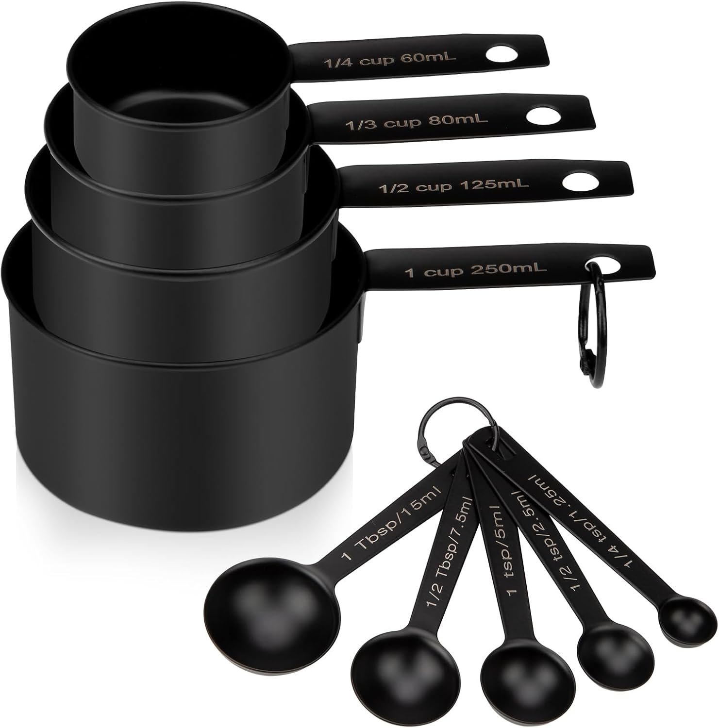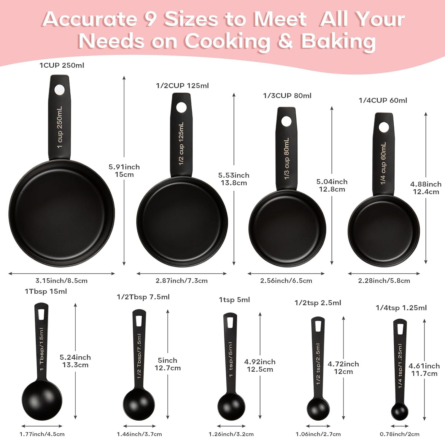 【9 SIZE MEASURING CUPS AND SPOONS SET】 9 measuring cups kits with different capacities can meet all your cooking and baking needs. Measuring cups and spoons set include:250ml, 125ml, 80ml, 60ml, 15ml, 7.5ml, 5ml, 2.5ml, 1.25ml.