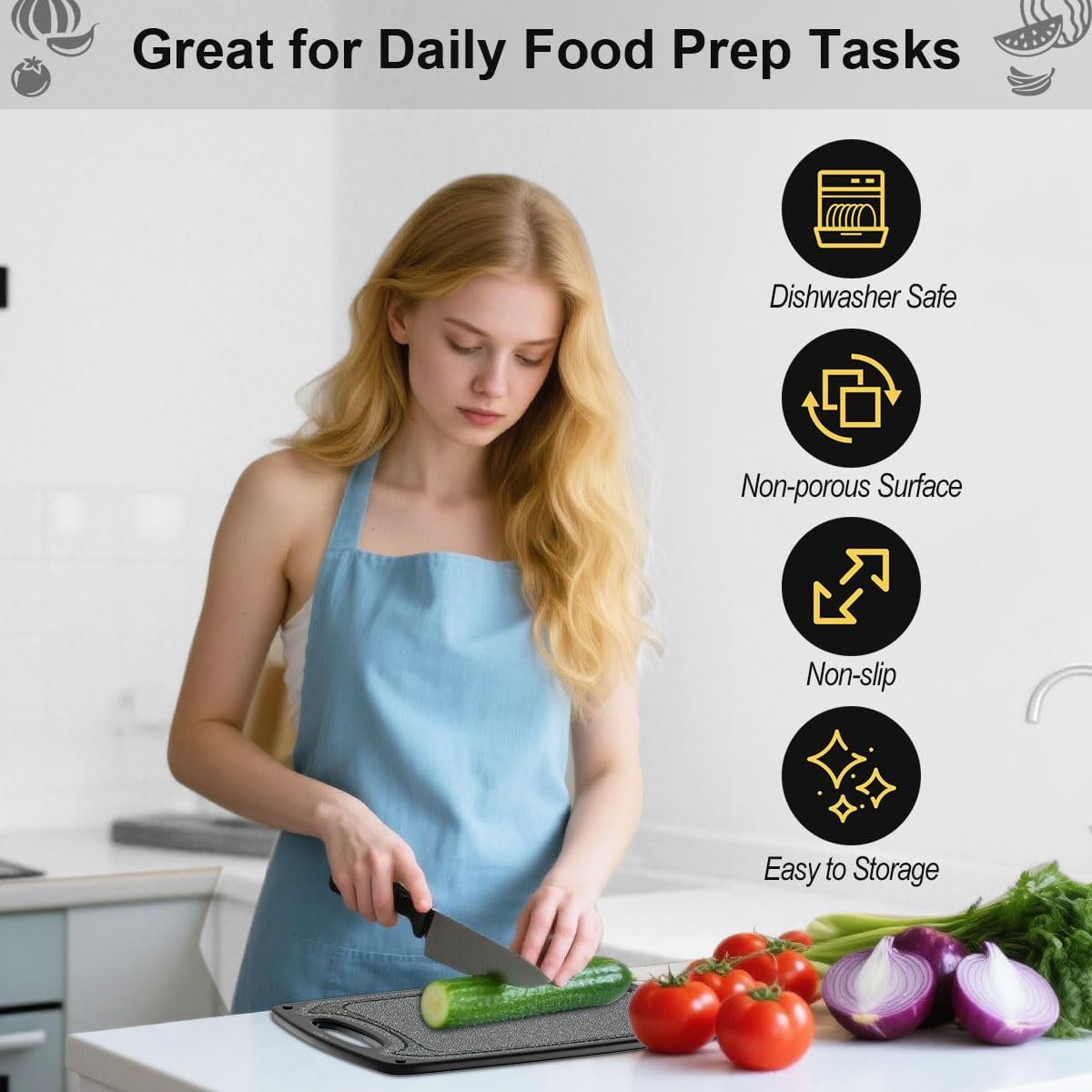 【Easy Grip and Non-Slip】Non-slip rubber feet keep these cutting boards stay on the countertop and the handle makes cutting board easy to grip, and it is also convenient to hang it on the wall, space saving kitchen accessories.