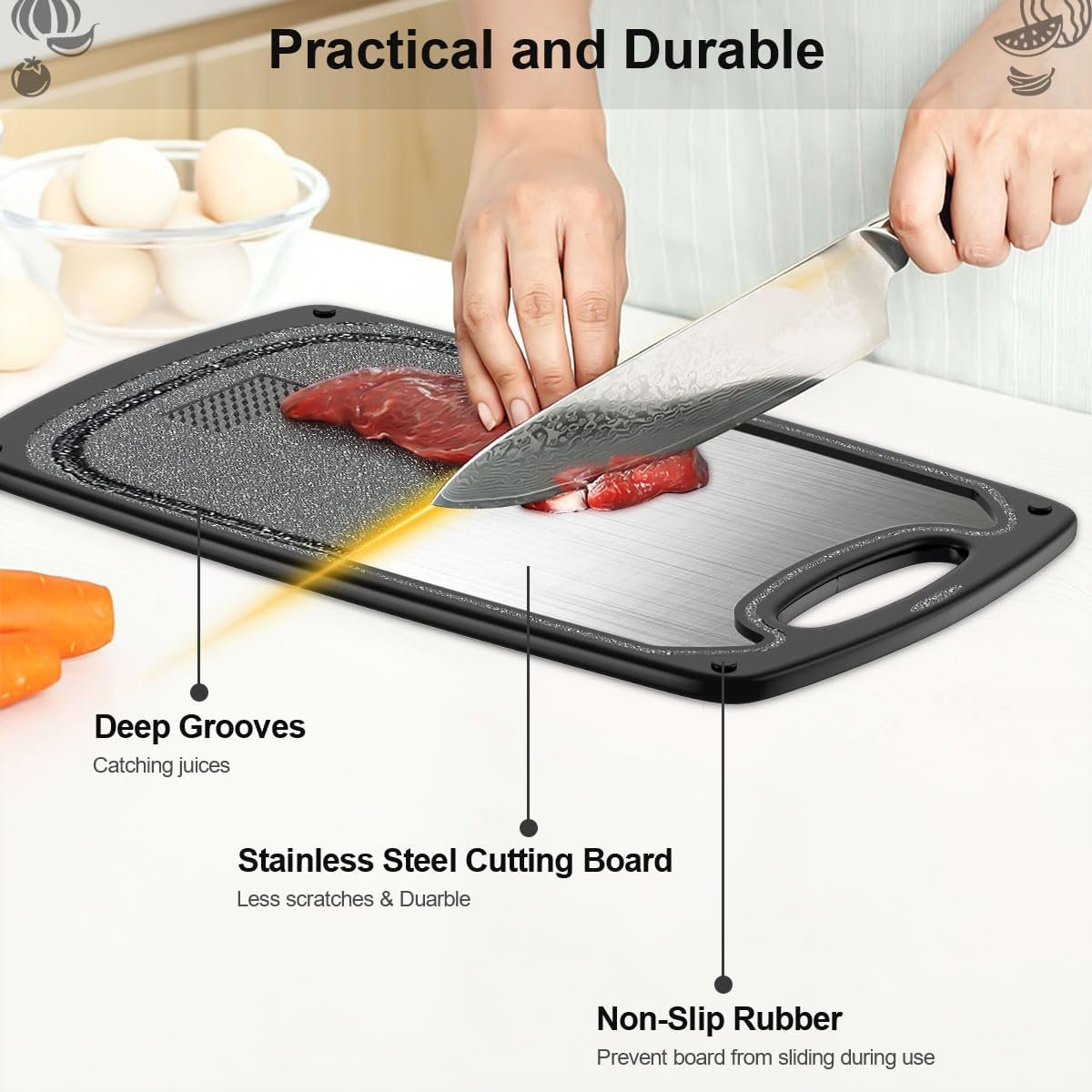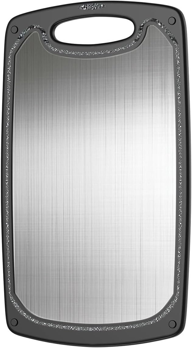 【Dishwasher Safe&Knives Friendly】 Non-porous design makes steel cutting boards for kitchen easy to clean, and it is a dishwasher safe cutting boards. Both surfaces are knives friendly and tough enough to withstand chopping, cutting and dicing.