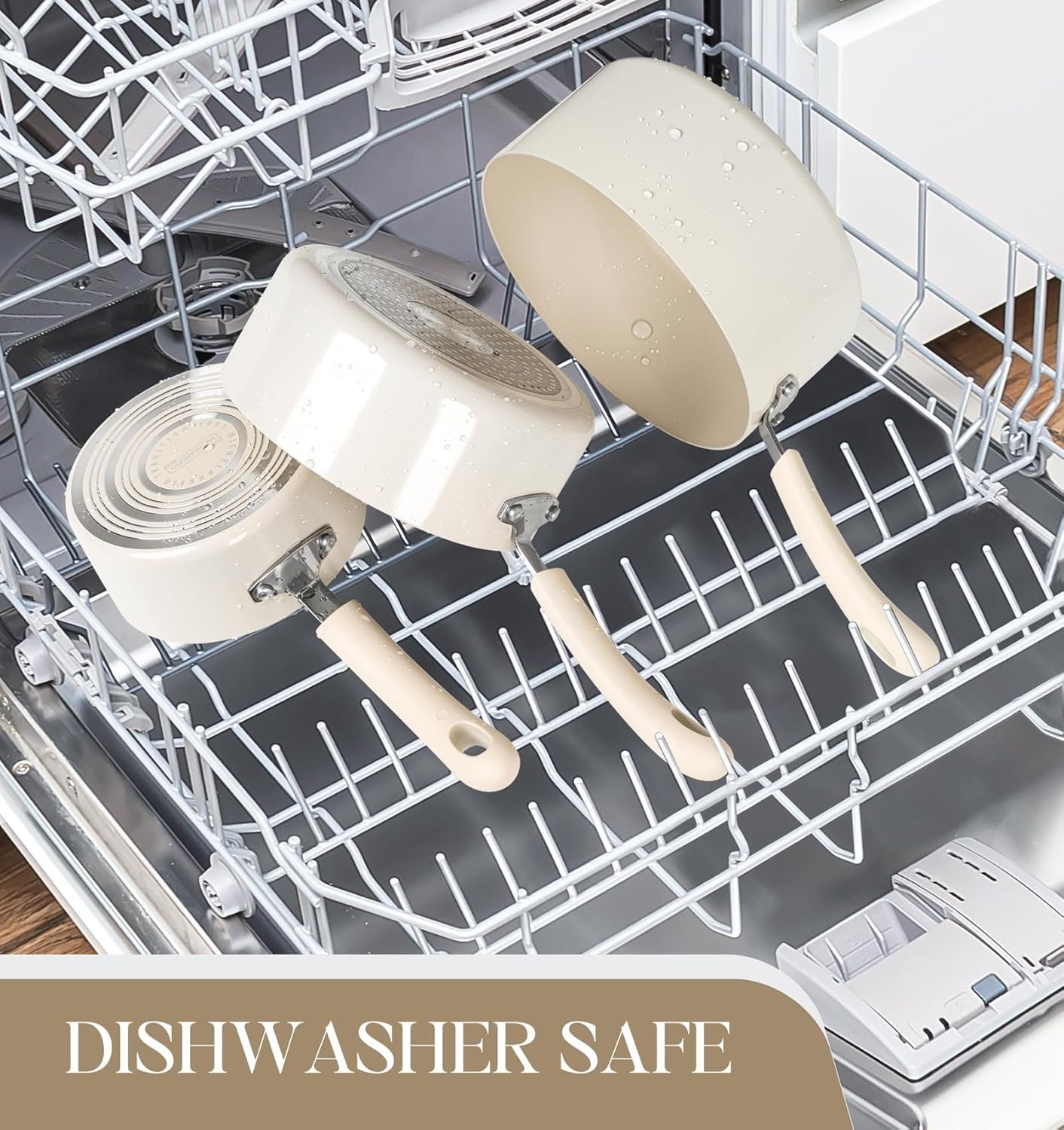 [FAST & EVEN HEATING] – The pots in our sauce pan sets have durable aluminum alloy bases that greatly enhance heating performance. The kitchen pots are suitable for all stovetops. Tip: All but the 1 quart canbe used on induction. Dishwasher safe.