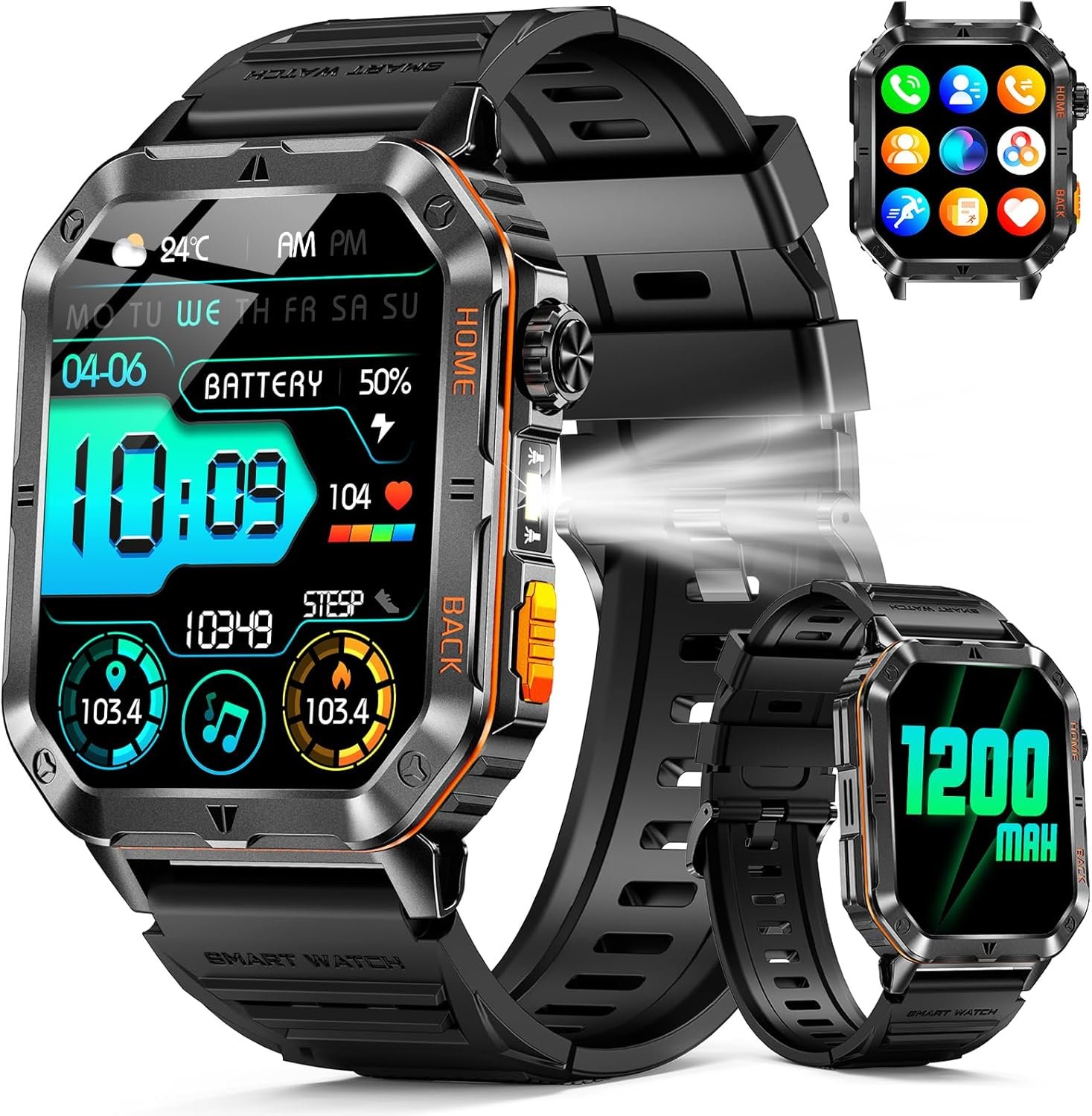 Military Smart Watch for Men, 2.01” Fitness Tracker with 1200mAh Long Battery Life, Bluetooth Calls, Flashlight, IP68 Waterproof, Heart Rate/Sleep Tracking, 100+ Sports Modes for Android iPhone