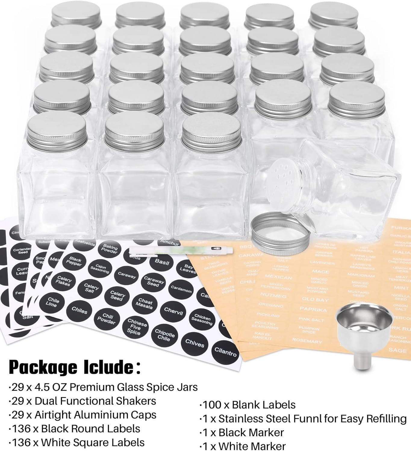 Package Include 29 x 4.5 OZ Premium Glass Spice Jars 29 x Dual Functional Shakers 29 x Airtight Aluminium Caps 136 x Round Black Labels 136 x White Square Labels 1 x Stainless Steel Funnl for Easy Refilling 2 x 1 x Marker