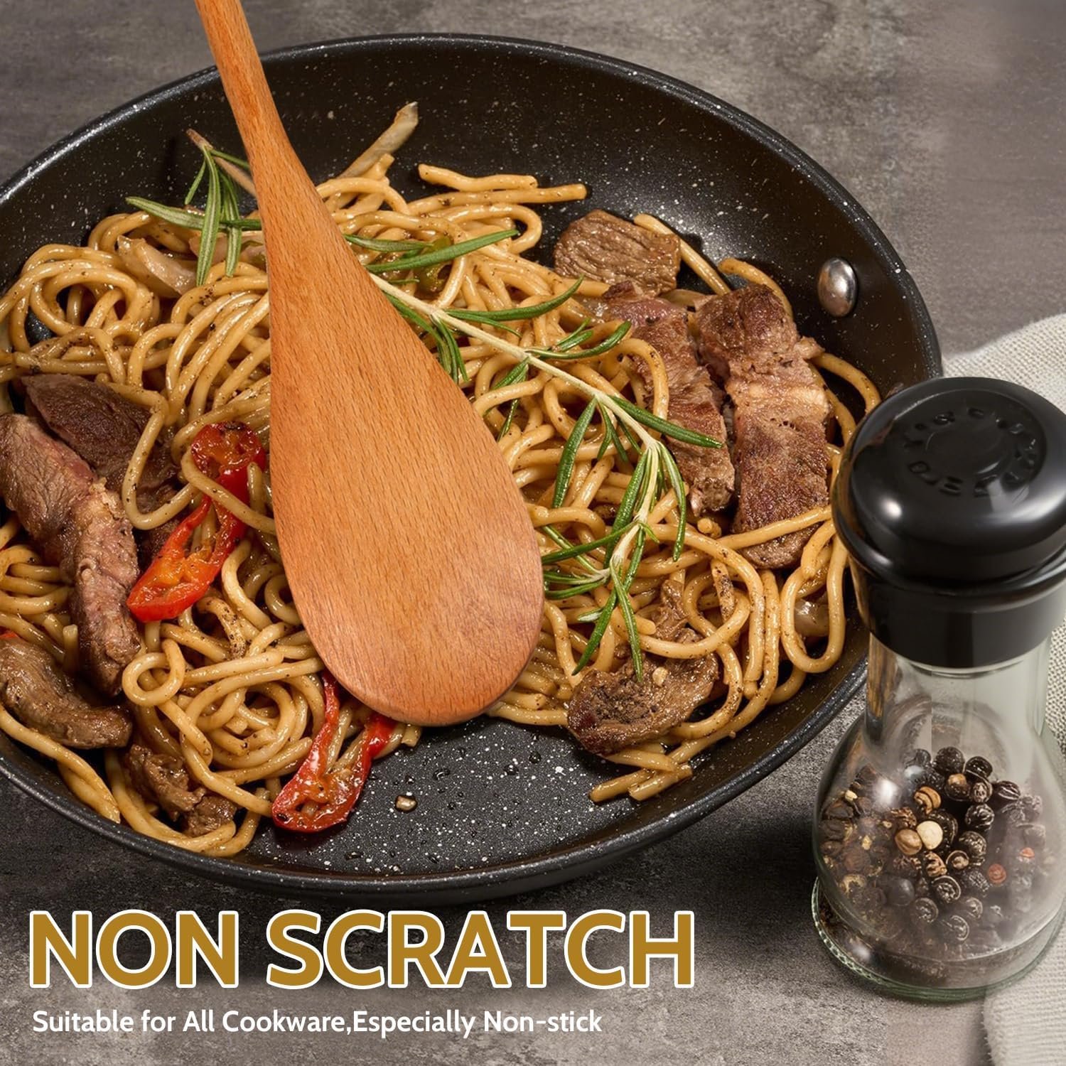 Food-Safe Coating: Featuring a water-based varnish coating, our wooden spoons block 99.9% of water/oil penetration, greatly reducing wood cracking risk, while their non-stick surface repels honey, jams, and sauces for 5-second wipe cleans