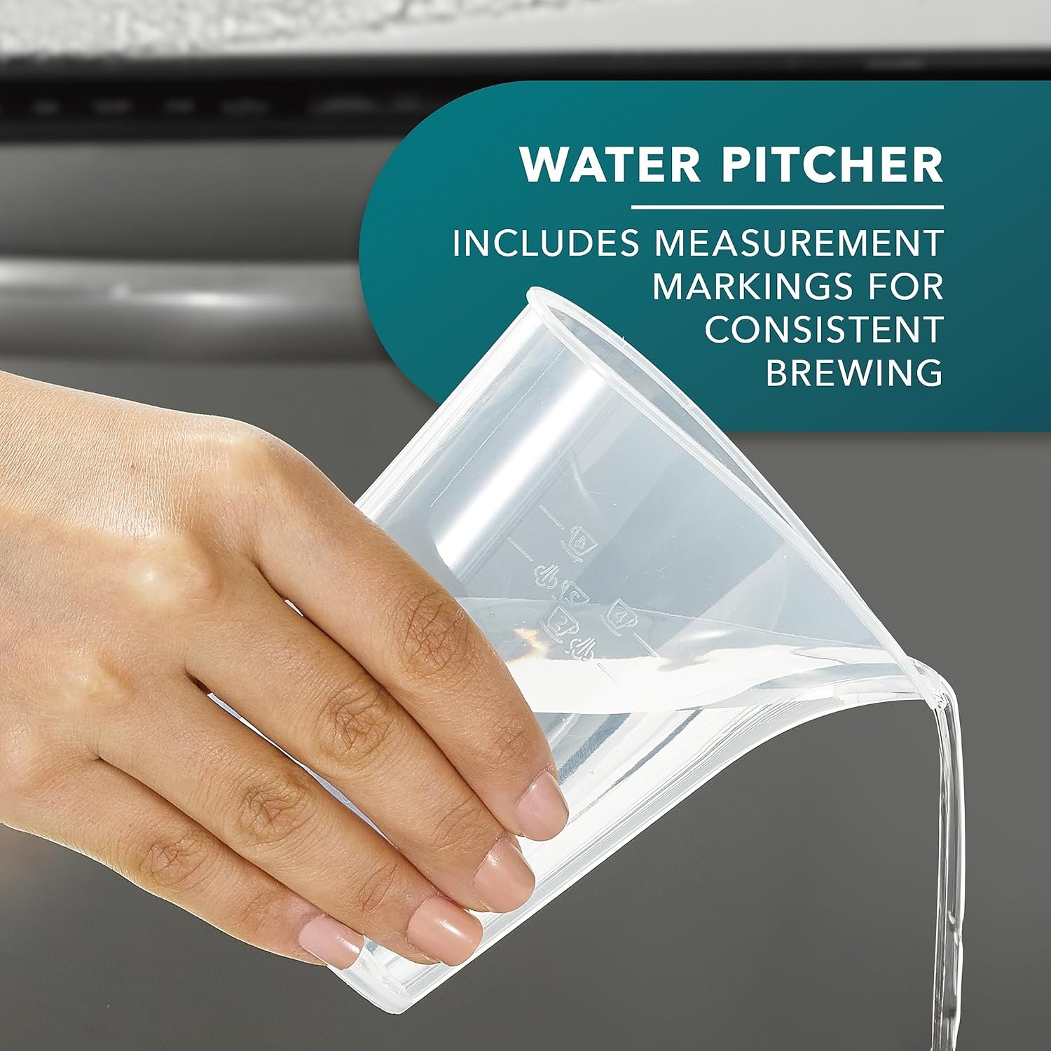 Water Pitcher: Water pitcher features measurement markings for consistent brewing and steaming