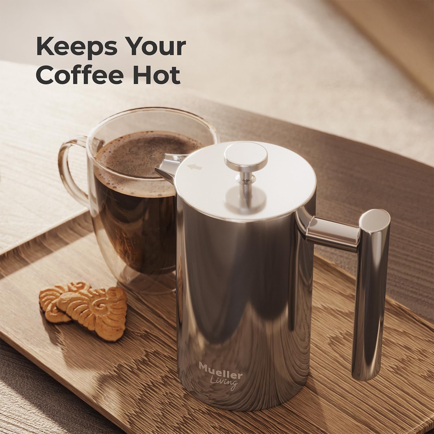 MuellerLiving French Press Coffee Maker 20oz, Stainless Steel French Press Coffee, 4 Filter Heat Resistant Double Insulated, Rust-Free, Food Grade, Dishwasher Safe Coffee Pot