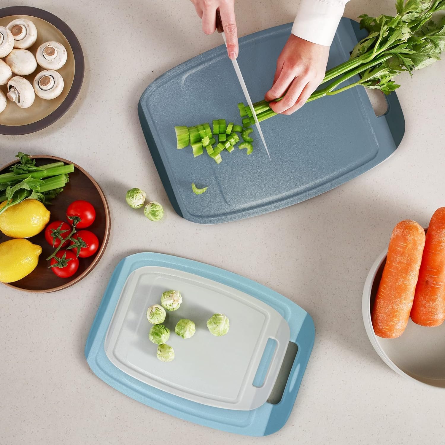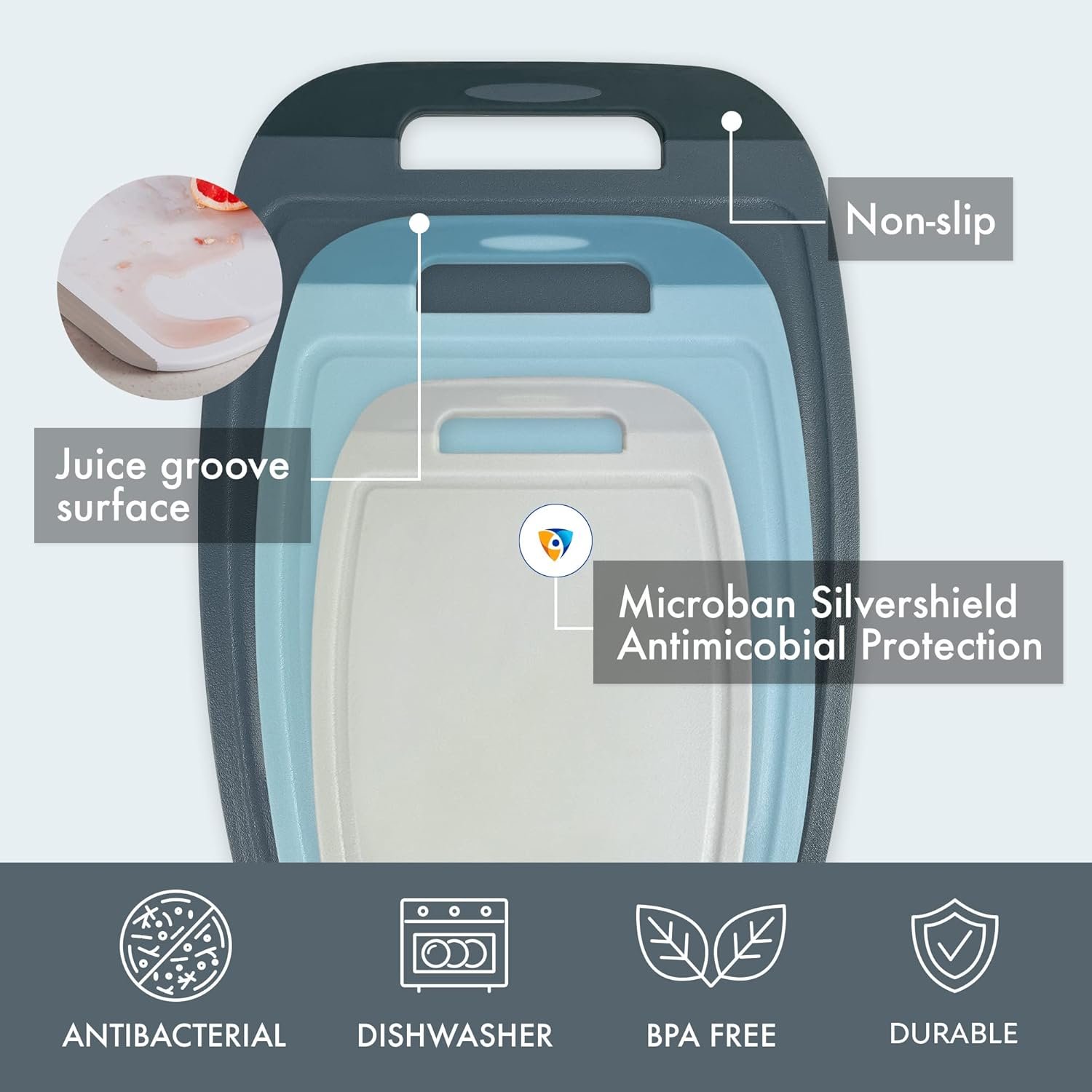 Neoflam Microban Antimicrobial Plastic Cutting Board 3 Sets, BPA Free, Non-Slip EZ Grip Handle, Dishwasher Safe, Reversible Use, Large Juice Grooves, Blue Gray