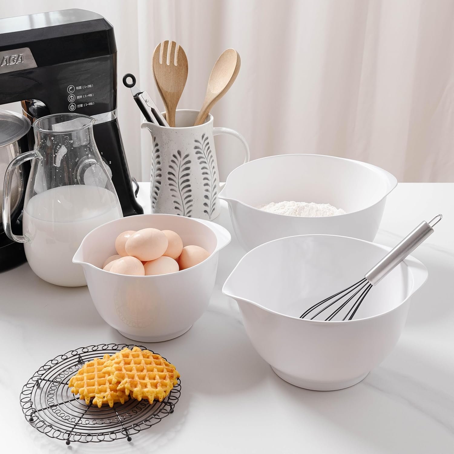 NESTED MIXING BOWLS: Set nests for easy storage and convenience, a functional set that saves you space to free up extra room in the cupboard for other kitchen tools.
