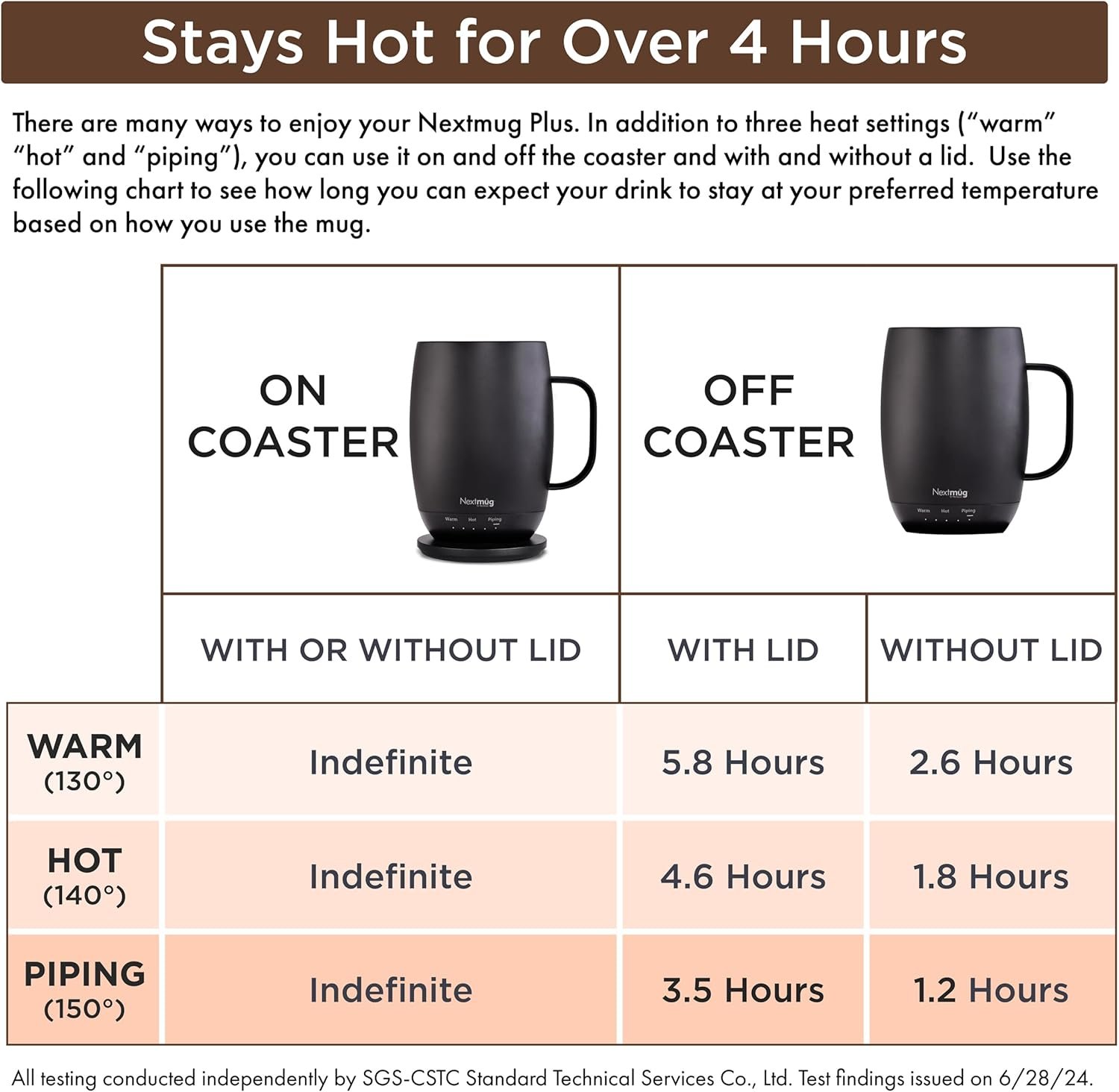 THE BIGGEST NEXTMUG – With 18 oz. of liquid capacity, the Nextmug Plus holds 29% more coffee or tea than the standard 14 oz. Nextmug. In addition, the Nextmug Plus features our longest-lasting battery.