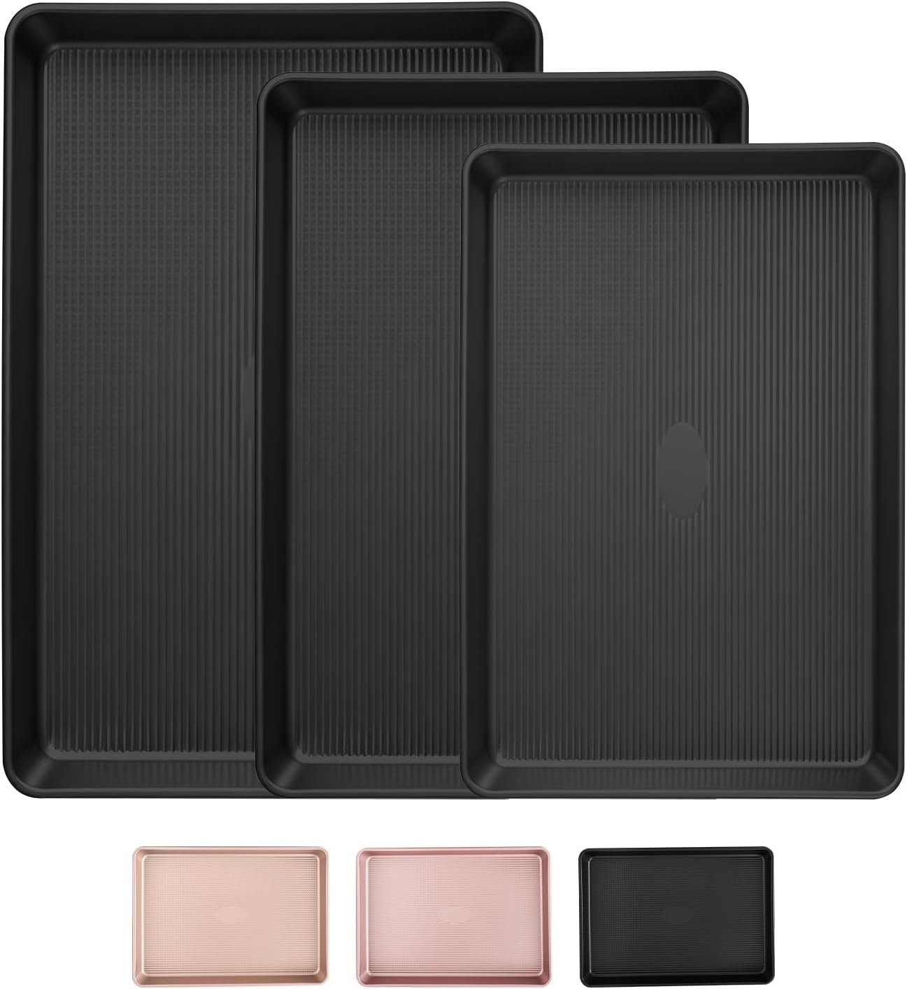 Nonstick Baking Sheet Pan Set of 3, Heavy Duty Cookie Sheets for Oven with Stripe Texture Pattern, 0.6mm Thick Quarter/Half/Jelly Roll Pans, Rust-Resistant & Easy Clean (Black)
