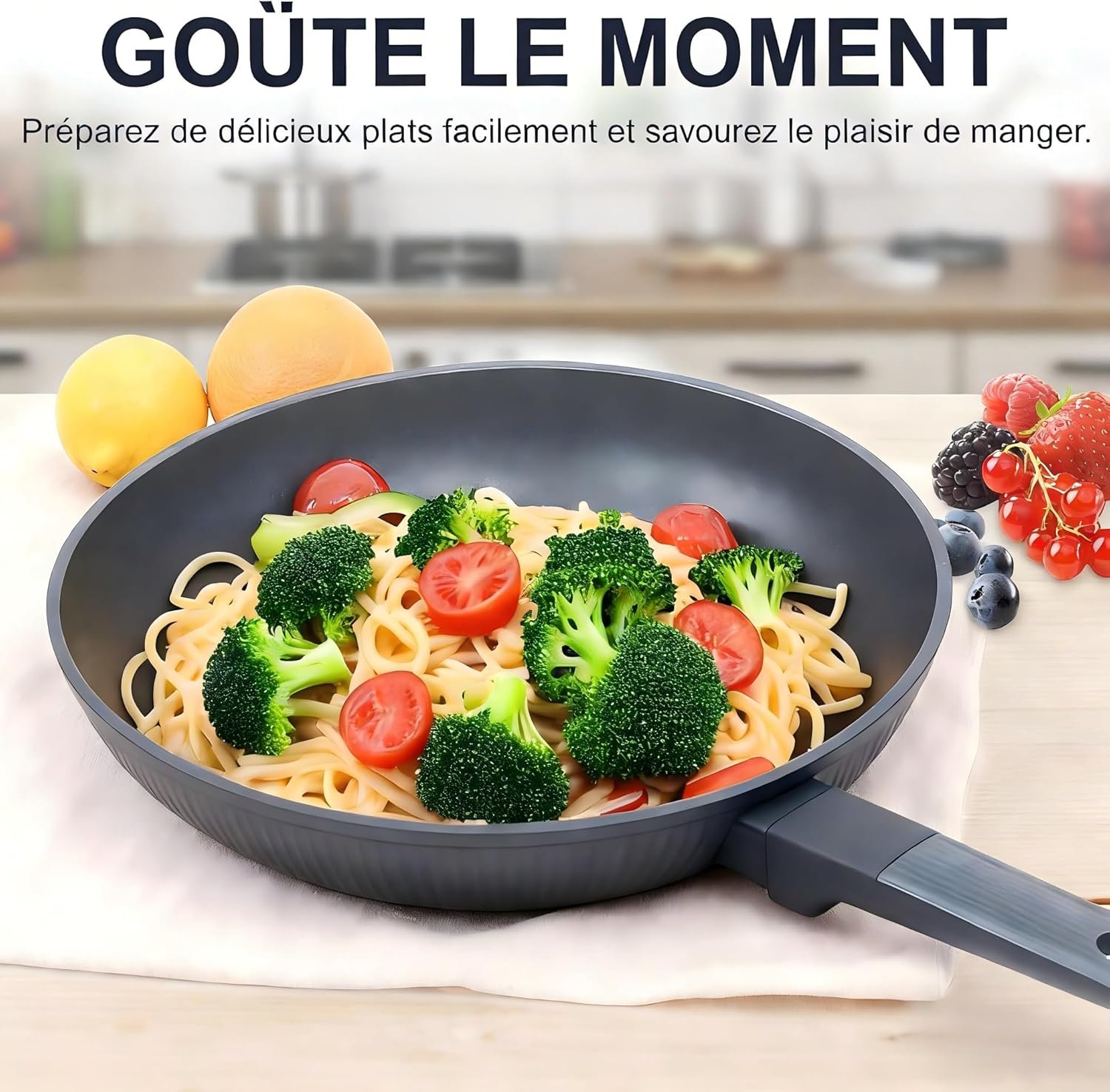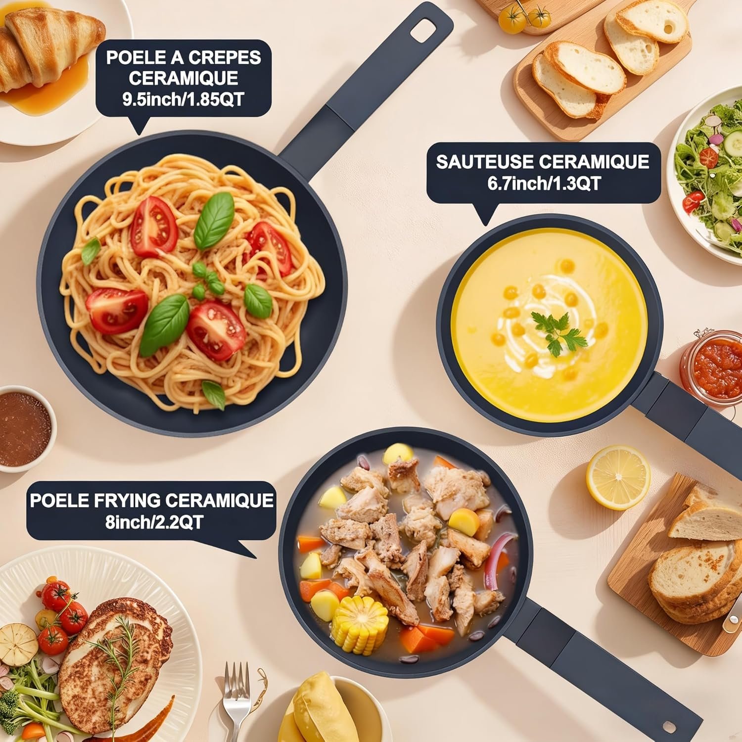 【Versatile 3-Piece Set – Saucepan, Skillet & Stockpot】 This complete “pots and pans set” includes a 6.7-inch saucepan, a 9.5-inch frying pan, and an 8-inch stockpot with lids. It’s designed for every cooking task—frying, boiling, sautéing, and simmering—making it the only “cookware set non stick” you need for daily meals.