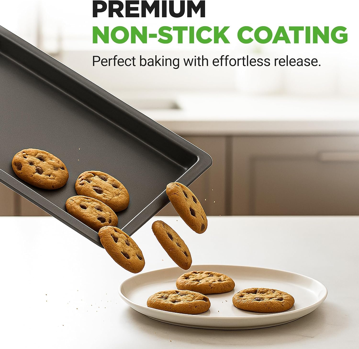 Features: – Professional Home Kitchen Bake Pans – Commercial Grade Restaurant Quality Metal Bakeware – Durable and Reliable Cookie Sheet Oven Pan Style – Attractive, Stylish Metallic Coating – Non-Stick Coated Layer Surface – Dishwasher Safe – Long-Lasting, Stain-Resistant and Easy-to-Clean – Premium Food Grade Bake Pan Construction – Space-Saving Stackable Wide Tray Pan Design – Not Recommended for Microwave and Any Appliances that Use Fire – Ideal Use for Baking Cake, Cookie, Bread, Brownies, Lasagna, etc. – Used with Kitchen Ovens, Countertop Convection Ovens, Toaster Ovens – Great for Food Prep, Serving, Pastry Dessert Baking – PFOA, PFOS, PTFE Free What’s in the Box: – (1) Large Cookie Sheet – (1) Medium Cookie Sheet – (1) Small Cookie Sheet Technical Specs: – Temperature Resistance: Up to 446° Fahrenheit (230° Celsius) – Metal Tray Thickness: 0.5mm – Construction Material: Engineered Carbon Steel Metal Alloy – Large Cookie Sheet Size (L x W x H): 17’’ x 11.43’’ x 0.8’’ -inches – Medium Cookie Sheet Size (L x W x H): 14.6’’ x 10’’ x 0.8’’ -inches – Small Cookie Sheet Size (L x W x H): 13.2” x 8.7” x 0.8” -inches.