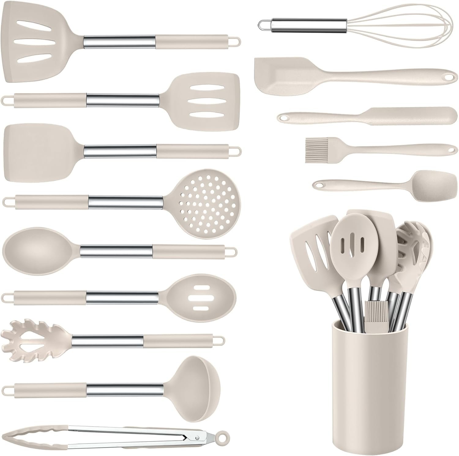Onader Silicone Cooking Utensils Set of 15, Kitchen Utensils Set with Holder for Nonstick Cookware, 446°F Heat Resistant Stainless Steel Handle – Khaki