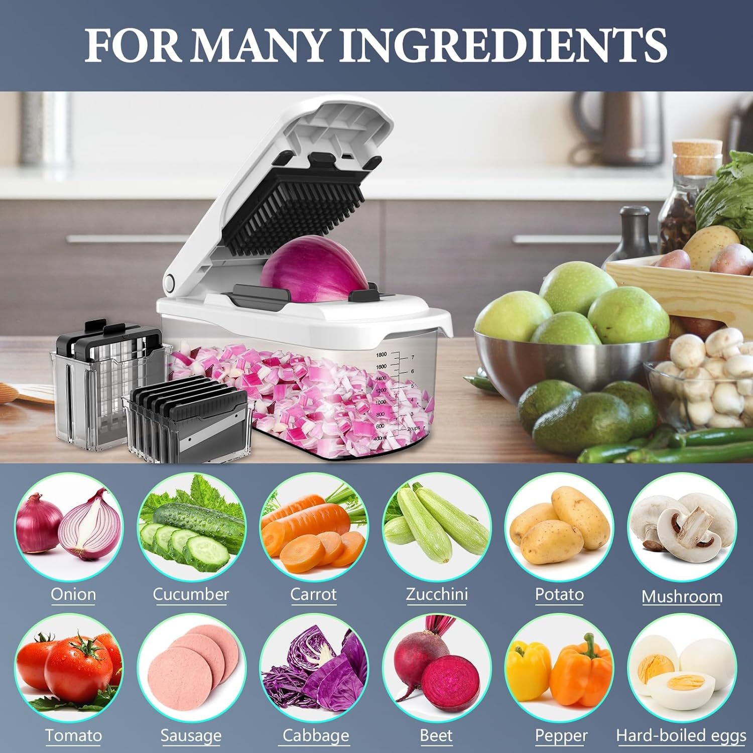 Ourokhome Food Chopper with Container, Manual Mandolin Vegetable Slicer Onion Dicer with 8 Blades, Hand Veggie Shredder for Potato, Tomato, Essential Kitchen Gadgets (8 in 1, White)