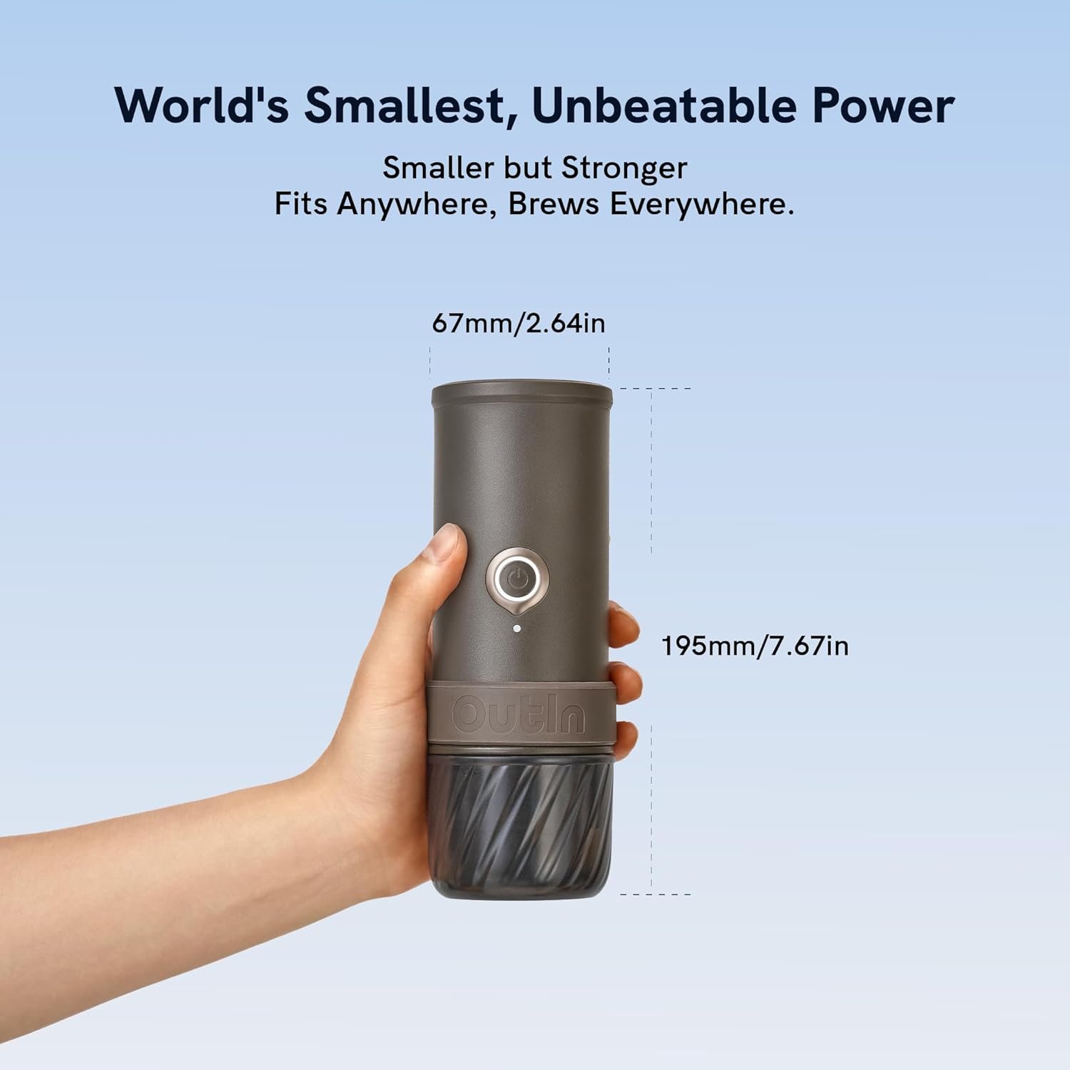 OutIn Mino Portable Electric Espresso Machine, Mini Camping Coffee Maker for Travel, Pocket Sized Coffee Machine Self-Heating, Ground Coffee & NS Capsule Adapter For Adventure