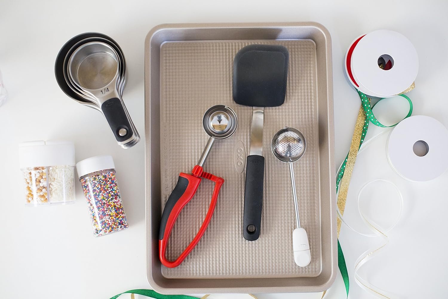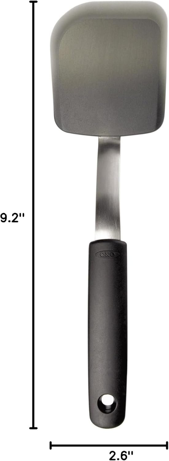 The Oxo Good Grips Cookie Spatula combines the strength of stainless steel with the advantages of silicone. The silicone outer layer, which is heat resistant to 600 Fahrenheit and safe for non-stick cookware, is bonded to a flexible stainless steel core for added stability. The Spatula’s thin, flexible edge glides easily beneath all foods and is the perfect size for getting between cookies on a crowded baking sheet or removing one brownie at a time from the pan. The rounded corner is great for getting sticky cookie dough out of the spoon and the angled handle keeps your hand away from fragile foods and hot dishes. The Cookie Spatula has a soft, comfortable, non-slip grip and is the perfect companion to non-stick cookware and bakeware.
