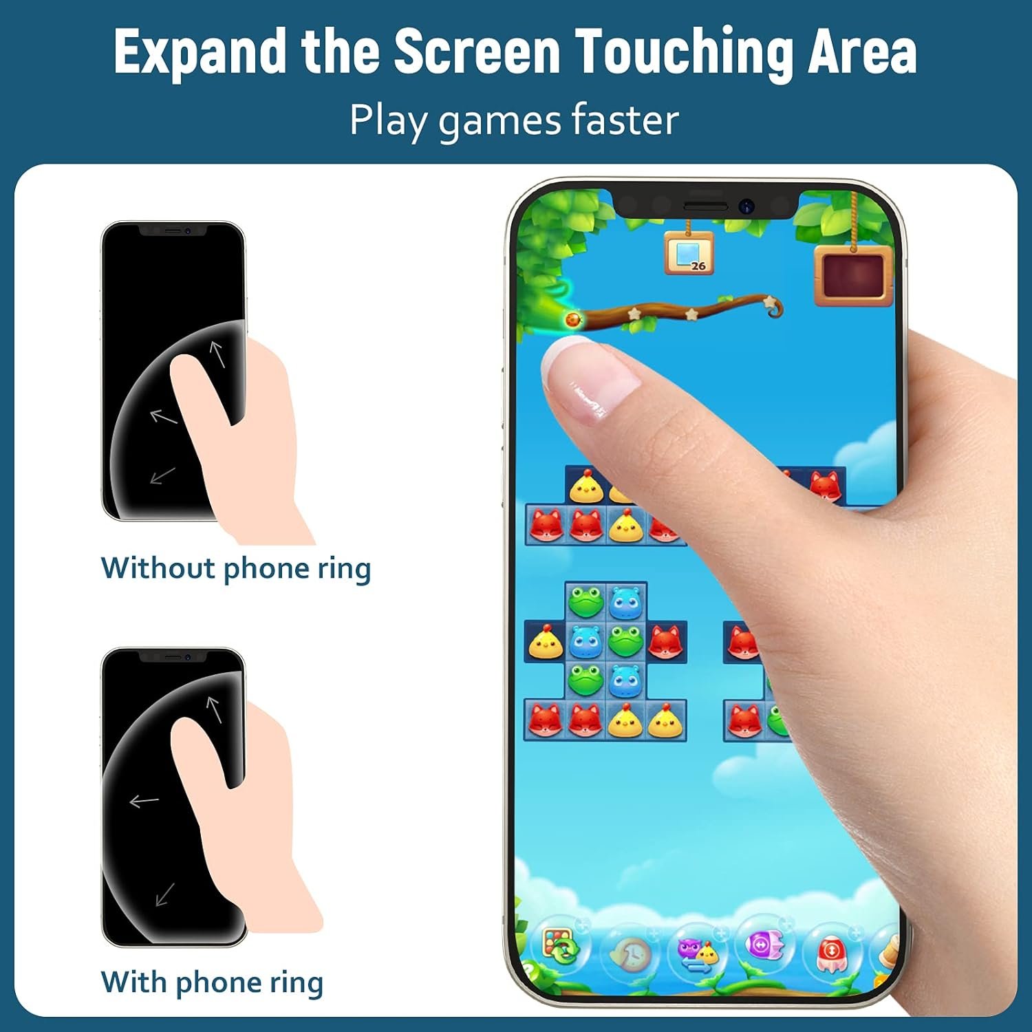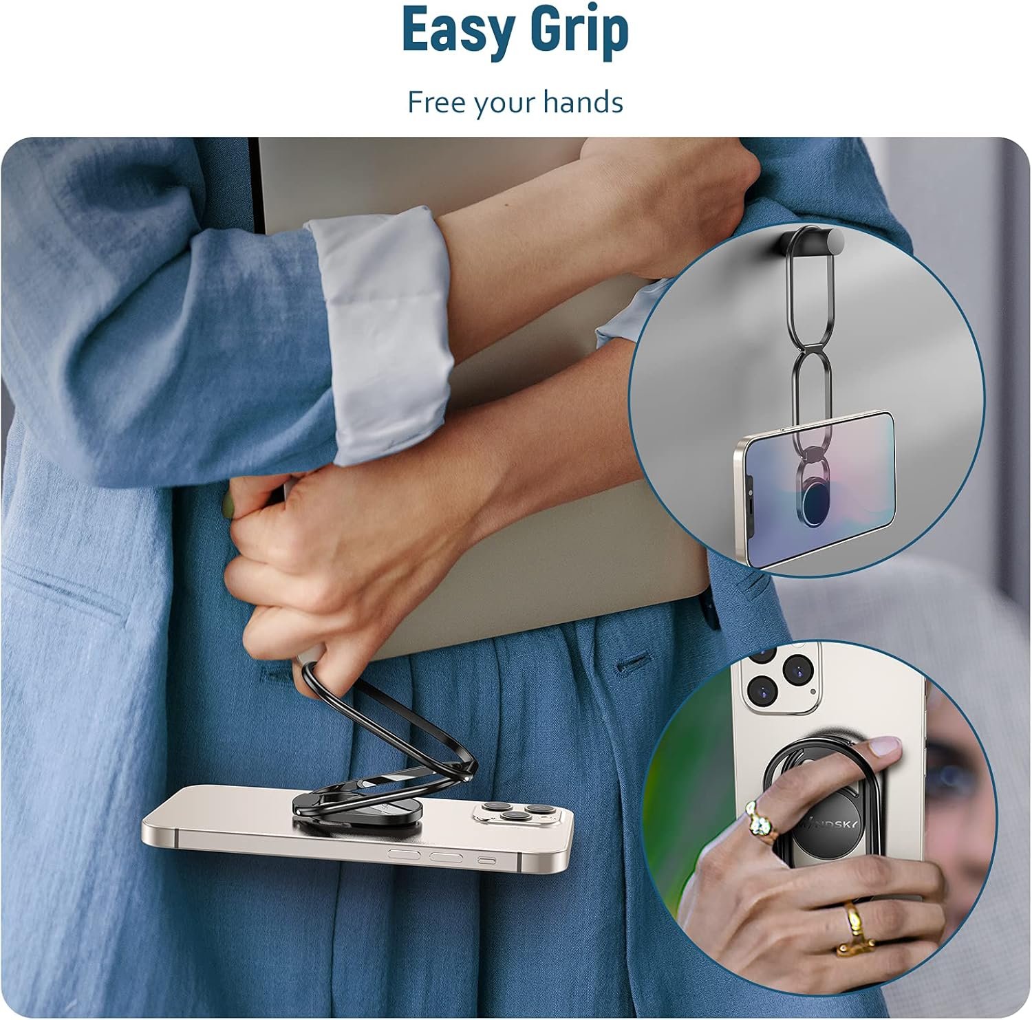 【Phone Grip and Desk Phone Stand 2in1】Double folded design provides infinite possibilities. The ring finger grip prevent your phone slipping from your hands on crowded bus and subways. Secure your phone for walking, traveling, hiking, gaming, selfies by one hand. Also a perfect solution to place your cellphone on office desk, kitchen counter or bedside table.