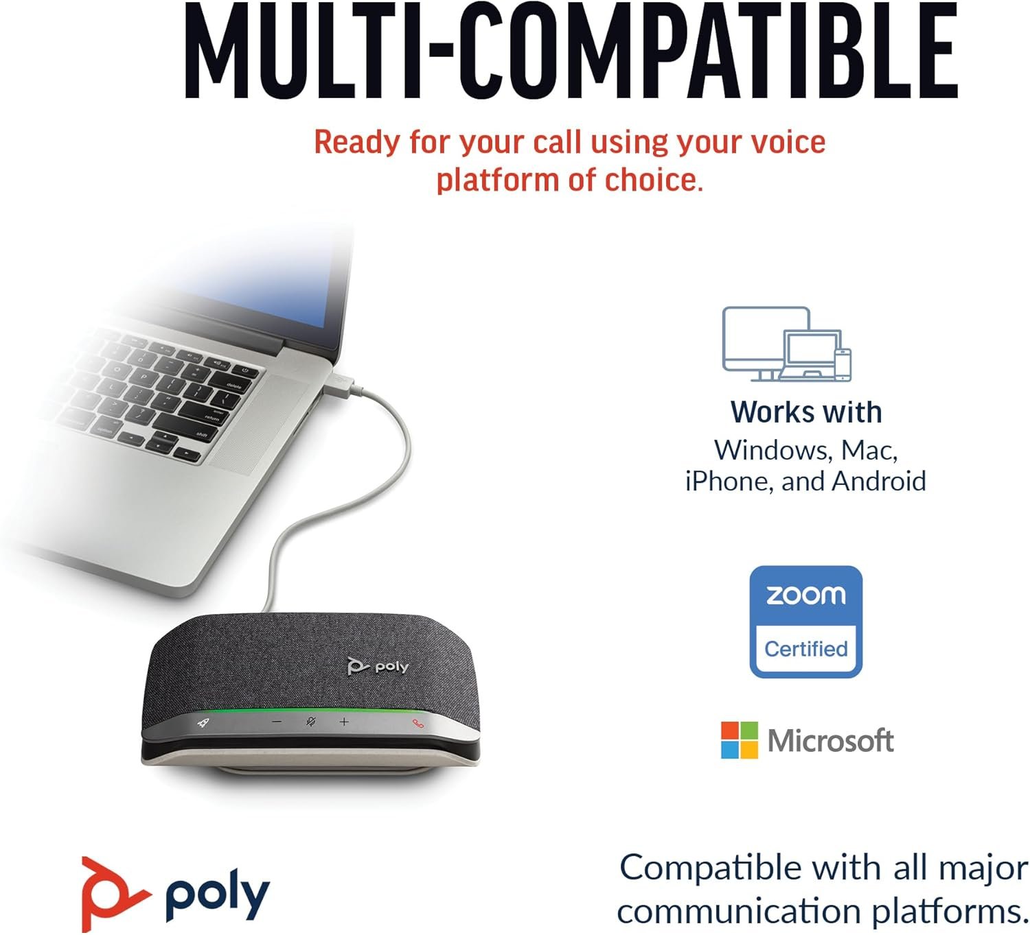 WORK ON THE GO: Keep your smartphone charged and ready using your Poly Sync 20 personal Bluetooth speakerphone, featuring up to 20 hours of battery life. It’s slim and portable, IP64 dust-and water-resistant, and comes with its own carrying case.