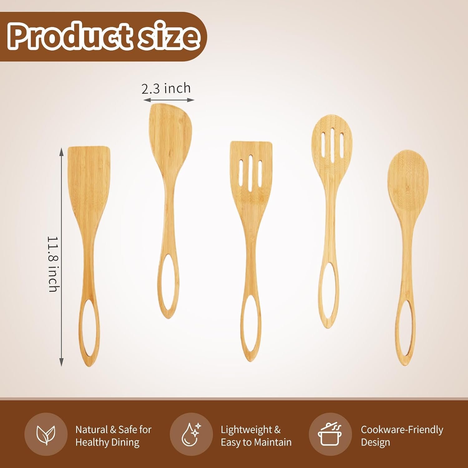Practical Bamboo Cooking Utensils Set: This bamboo spoon set includes 5 different functions spoon, each wooden spoon is approximately 11.8 inches long and 2.3 inches wide, ergonomic. You can use this set of bamboo cooking utensils for frying, baking, mixing, and flipping. It can meet all your daily cooking needs.