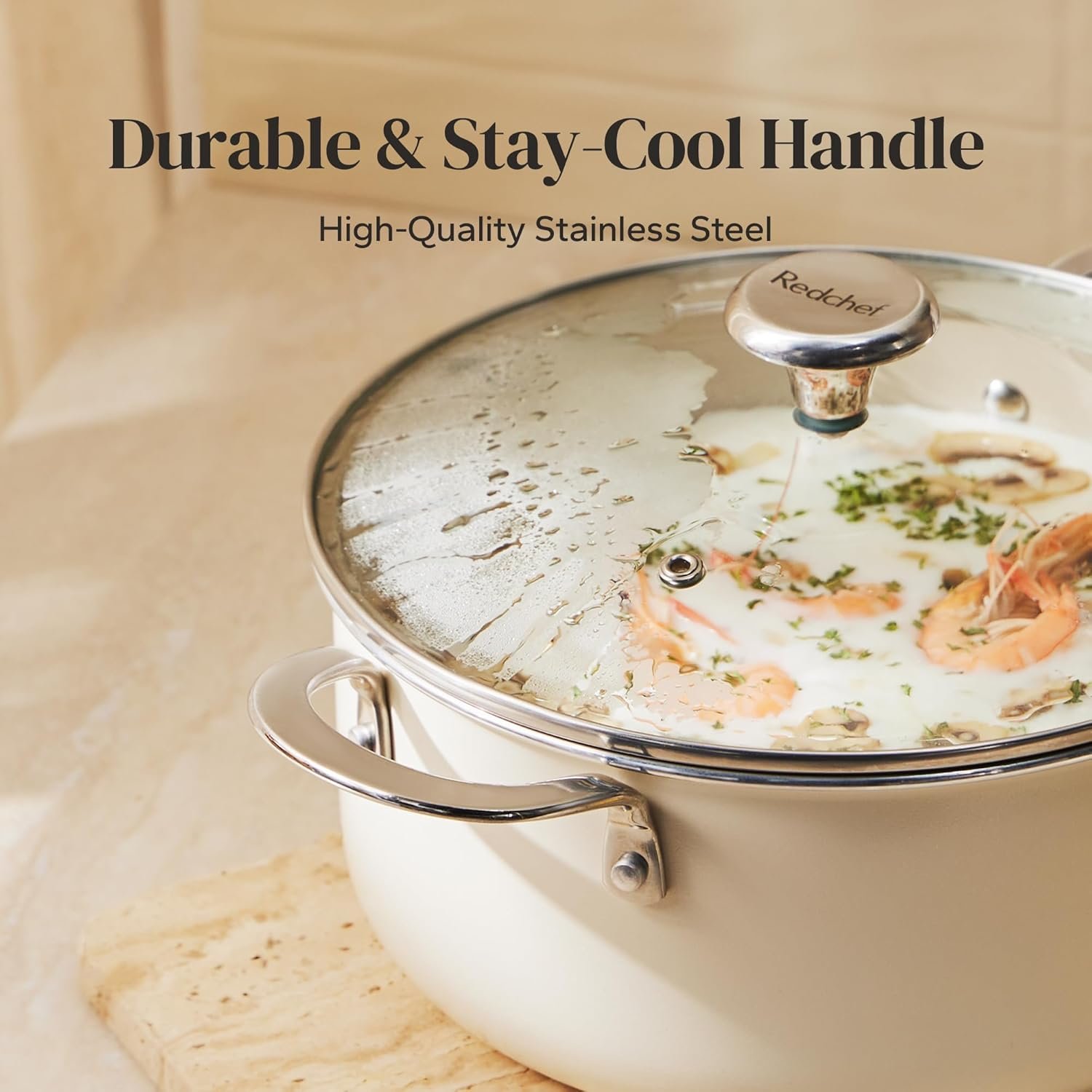 STOVETOP & EASY CLEANUP: Redchef soup pot adapts to induction, gas, electric, ceramic, and halogen stovetops.This cooking pot offers oven safe up to 842 °F, a ideal choice for full kitchen versatility.The durable ceramic coating is dishwasher-safe (handwash recommended for longevity), making cleanup quick and simple