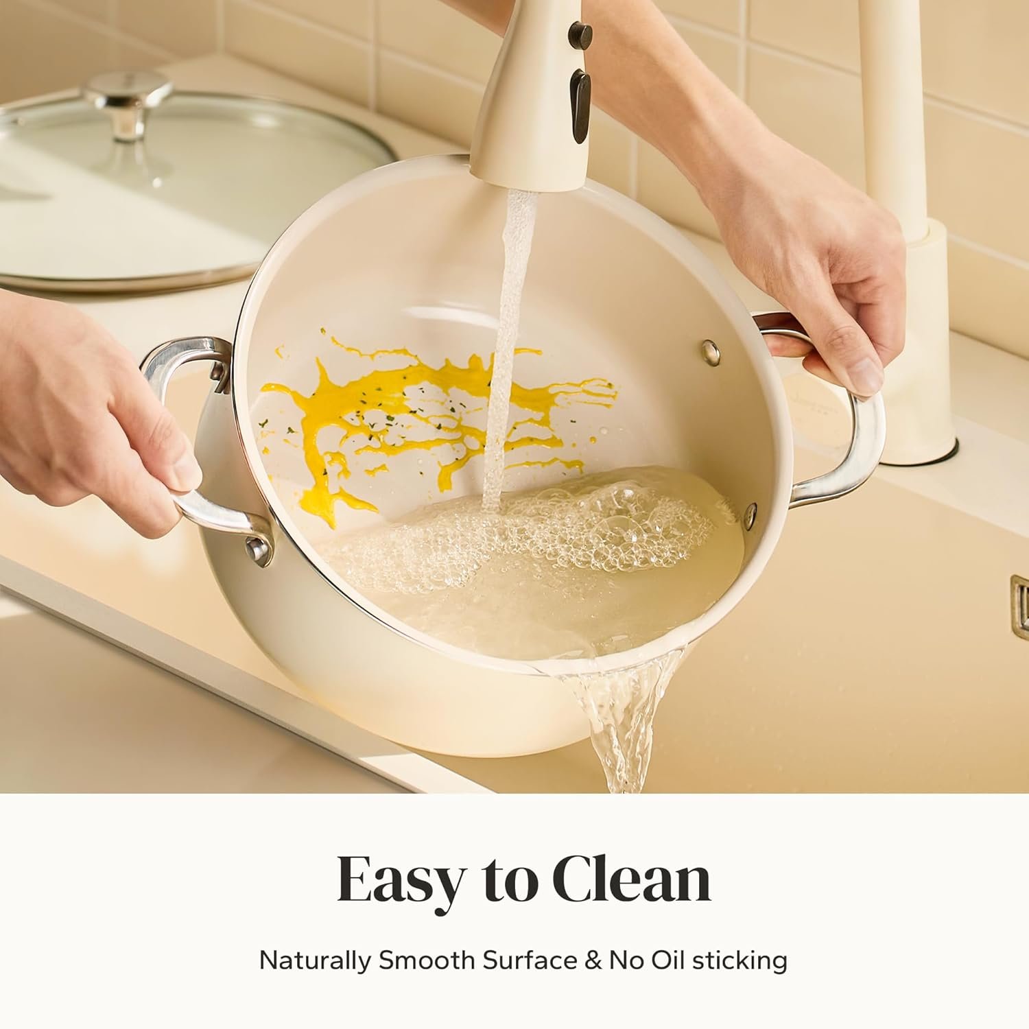 CERAMIC NONSTICK COATING: Cook with confidence using our advanced ceramic nonstick interior. The stock pot is free from Teflon, PFAS, PTFE, PFOA, lead, and cadmium. The toxin-free coating ensures easy food release without altering flavors, making it ideal for low-oil cooking and effortless cleanup. Enjoy healthier meals with peace of mind