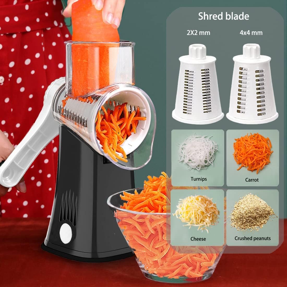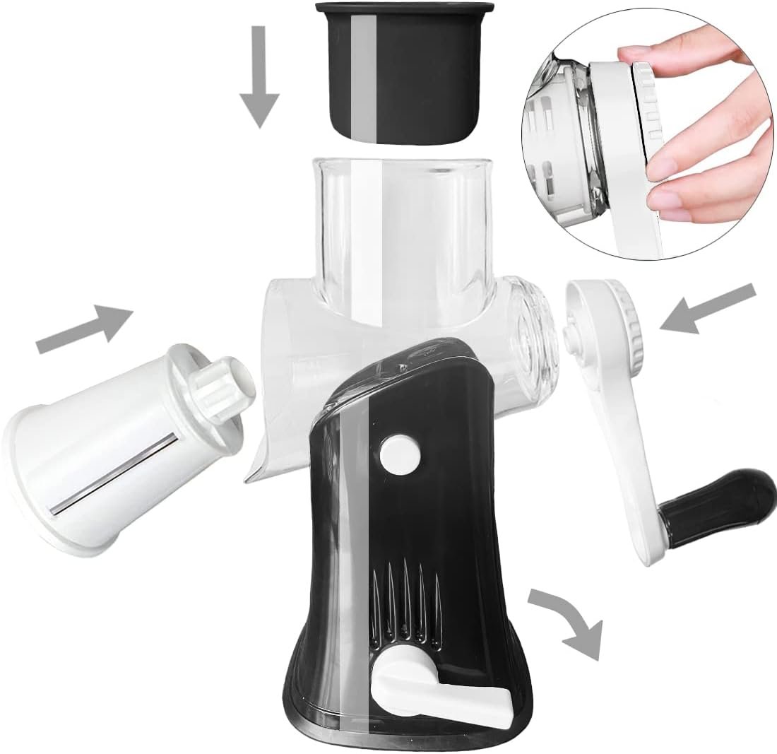 HUMANITY DESIGN – An upgraded powerful suction base keeps the cheese shredder firm in place on a clean or smooth countertop, for better operating and effortless hand grinding. The drum part and blades sit diagonally, so the grated ingredients fall down from the manual carrot shredder cheese grater smoothly, reduce any clogging