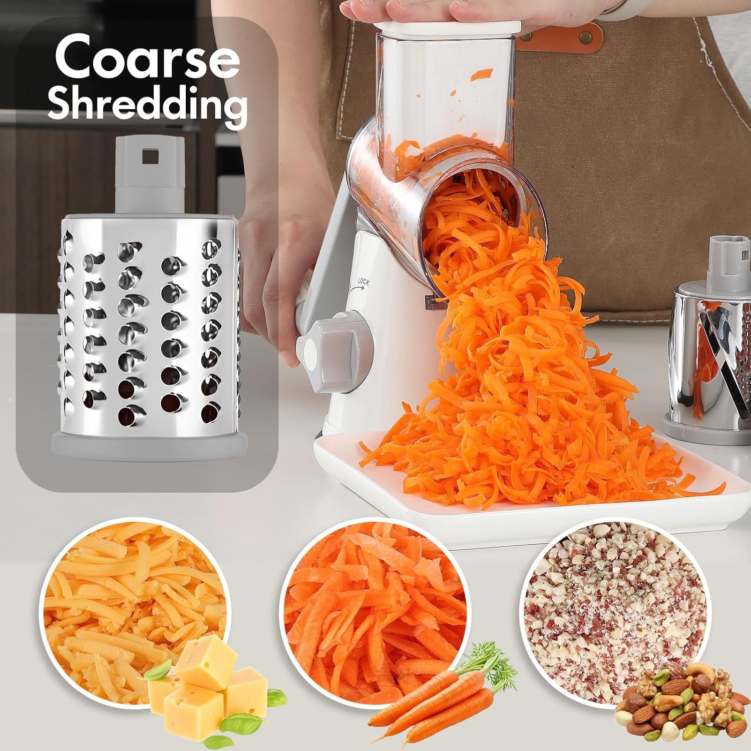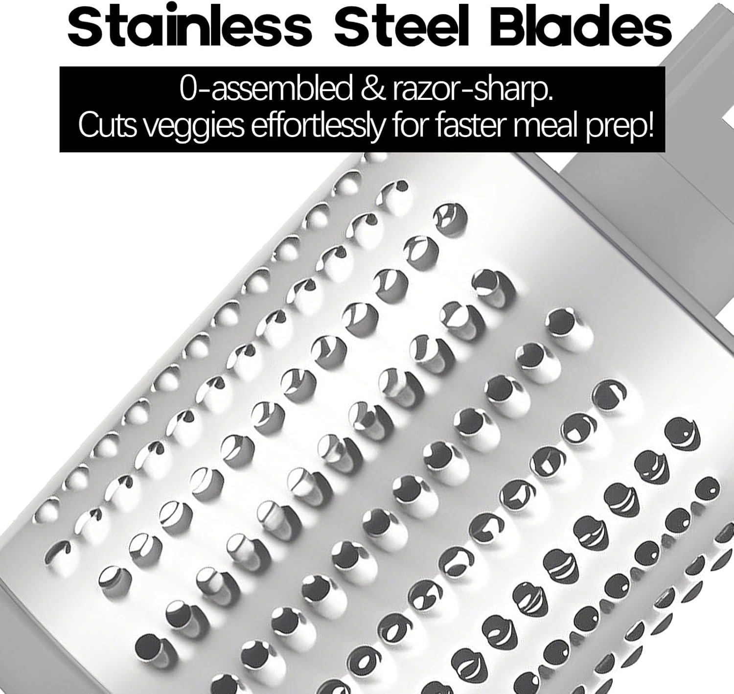 Grate, slice, shred, and grind with remarkable ease: Featuring three meticulously crafted blades, this cheese grater makes grating, slicing, shredding, and grinding a breeze. The all-stainless steel drum blade not only boosts its strength and durability but also delivers smoother, more precise cuts for a variety of foods. Plus, the blade requires no assembly and includes an enhanced number of knife edges, making food preparation faster and more efficient than ever