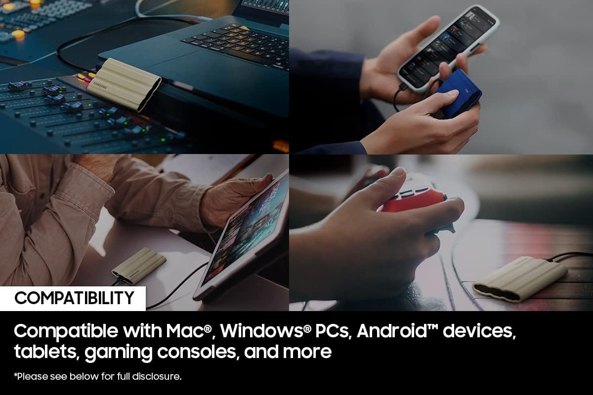 Samsung T7 Shield Portable SSD delivers high performance on-the-go, not matter the terrain. It has an IP65 rating for water1 and dust2 resistance, with Dynamic Thermal Guard to manage heat control. Transfer huge files instantly. USB 3.2 Gen 2 and PCIe® NVMe achieve soaring sequential read/write speeds of up to 1,050/1,000 MB/s4, allowing you to edit directly from the drive. The rugged design and advanced outer elastomer add extra durability to even endure a 9.8 foot drop3. The T7 Shield is compatible with PC, Mac, Android devices, gaming consoles, and more.