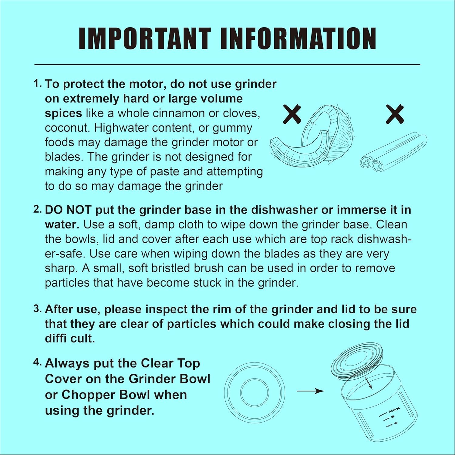 Note – Always put the inner lid on the bowl before grinding. Avoid exceeding the Max line volume at one time or grinding very hard foods such as cinnamon, cloves or coconut, as these foods may damage the motor, inner lid or cause other problems. There will be a certain sound when grinding