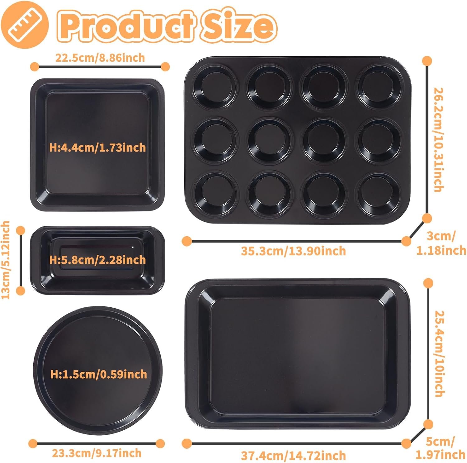 5PCS Baking Pans Set: ShellKingdom bakeware set have everything you need for your home kitchen. Including round cake pan, square cake pan, loaf pan, 12-cup muffin pan and deep roast pan. The nonstick baking pans set will fit into regular kitchen cabinets or under standard kitchen ovens. Also 1pcs of oven mitts is included.