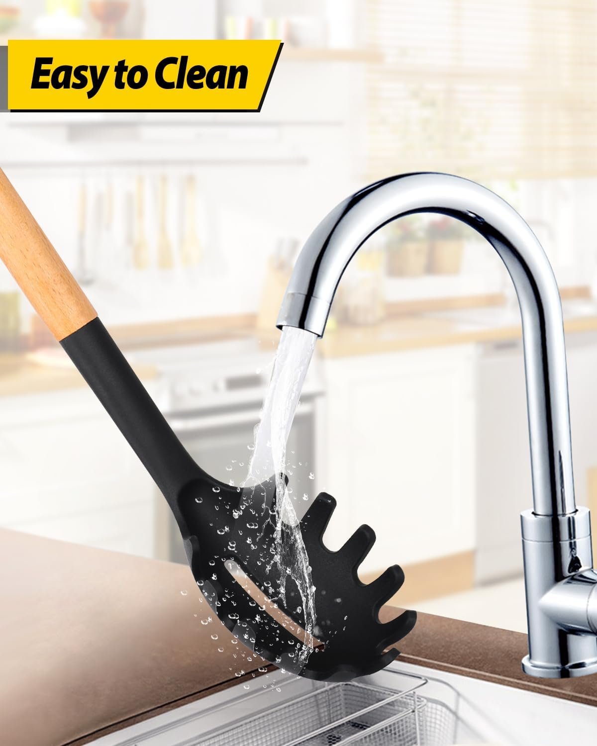 Thoughtful Design : Wooden handle keeps you away from the trouble of kitchen utensils rusting or breaking; This anti-scald wood handle is not easy to conduct heat and is more comfortable to hold than traditional utensils