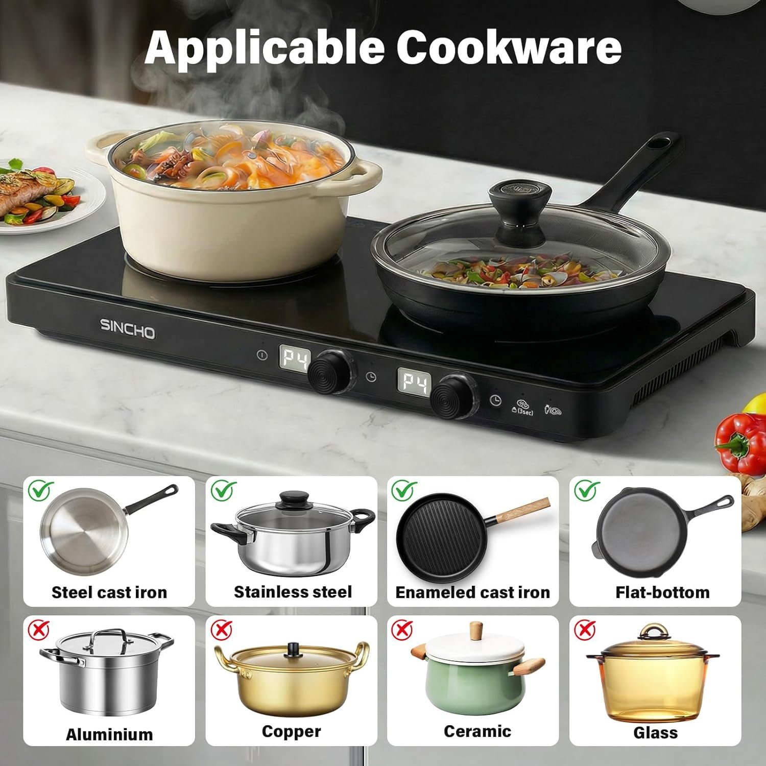 Upgrade your kitchen with the SINCHO Double Induction Cooktop—compact, powerful, and designed for real-life cooking needs. Perfect for small kitchens, dorms, RVs, or as an extra cooking space, this 1800W induction stove delivers fast, energy-efficient performance. The smart sensor touch controls offer 9 precise power levels and a 99-minute timer for full cooking control. Sleek, modern design with safety features like auto-shutoff and overheating protection. Cook smarter, cleaner, and faster—today’s kitchen essential for home chefs on the go.