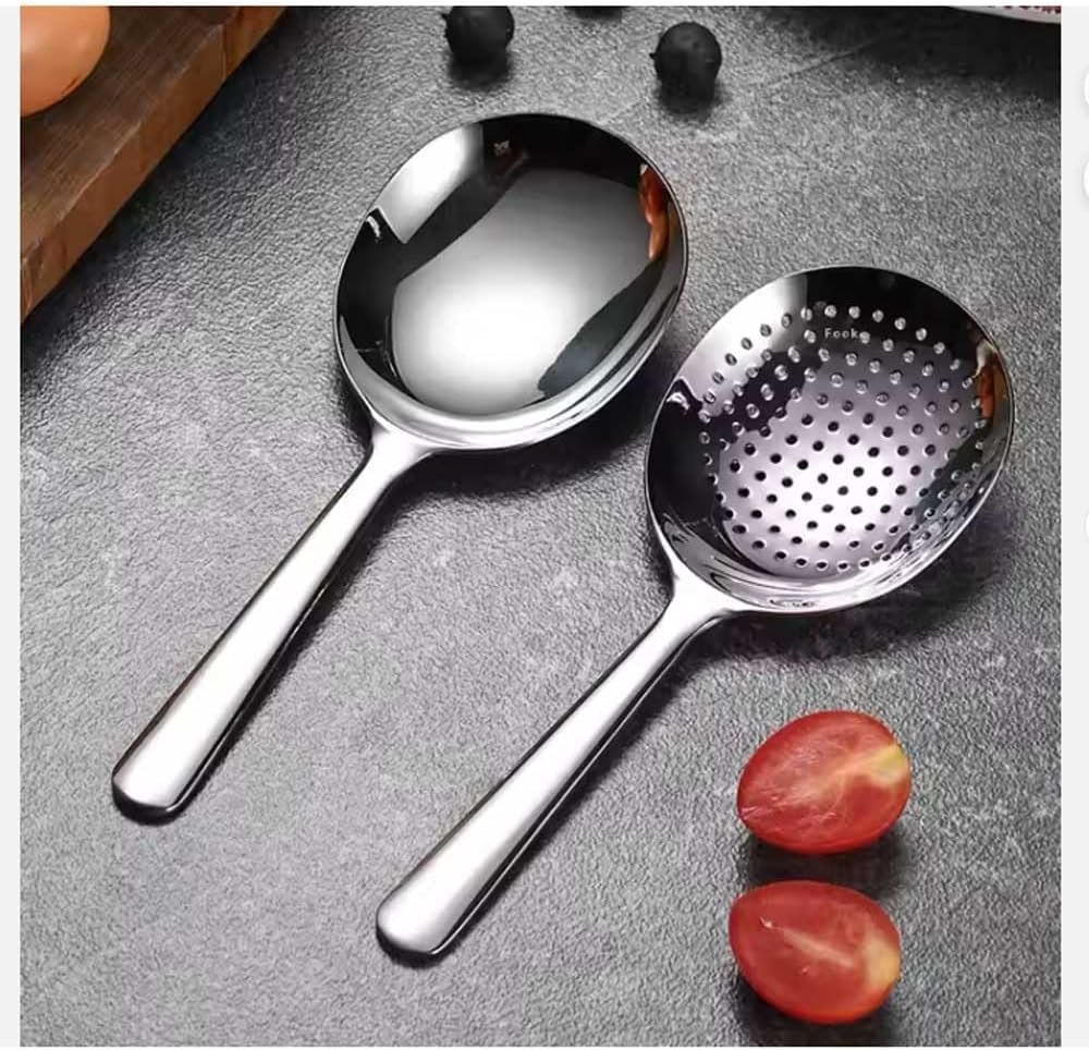 Skimmer & Ladle Set, Korean Style Serving Ladles, 1x Serving Ladle Spoon, 1 x Skimmer with hole, Stainler, 18/10 Stainless Steel, 7Inch Length, Silver, Korean Mukbang, Ramen