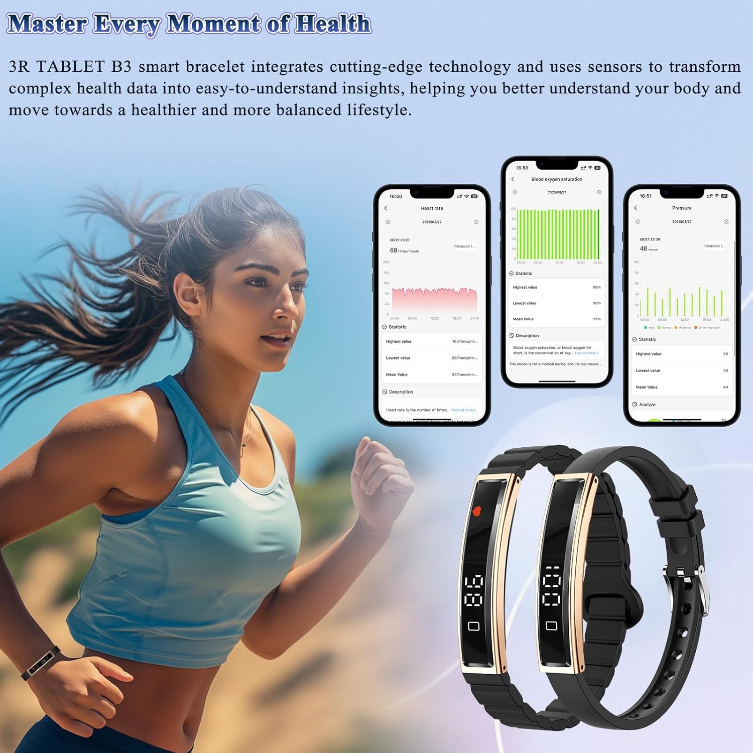Master Every Moment of Health: The B3 Smart Bracelet monitors heart rate changes 24/7 and safeguards your heart health. With one tap, the smart bracelet measures blood oxygen saturation(SpO₂) to stay informed about your body’s oxygen supply. Based on heart rate variability(HRV) analysis, the smart monitor bracelet scientifically assesses your stress levels, helping you relieve stress on time. The 3R TABLET B3 Smart Band is not just a fashionable accessory, but also a health manager on your wrist