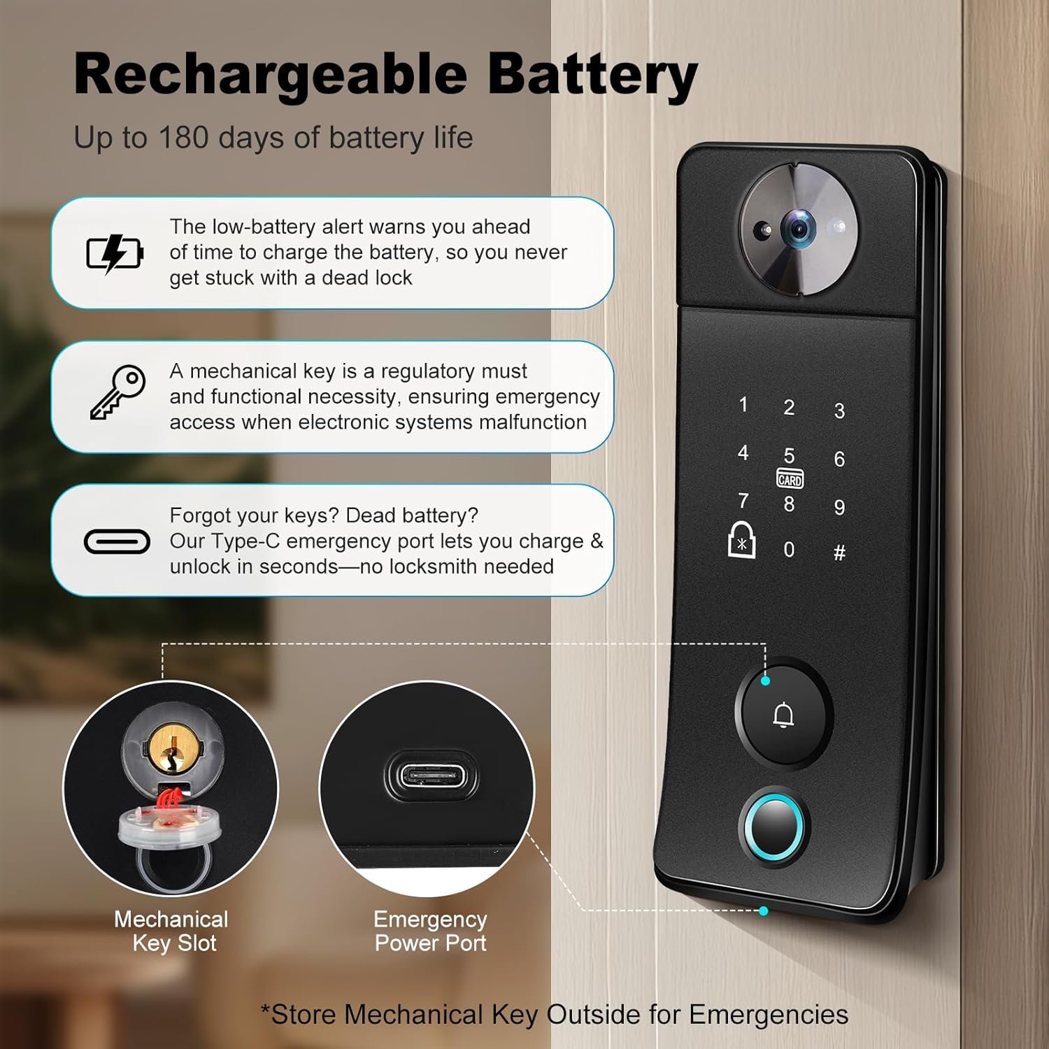Dual Emergency Solutions – No Lockouts: Even if the lock dies, you’re covered: use the Type-C emergency port (power it with a power bank) or the 2 included mechanical keys. You’ll never get stuck outside your home again