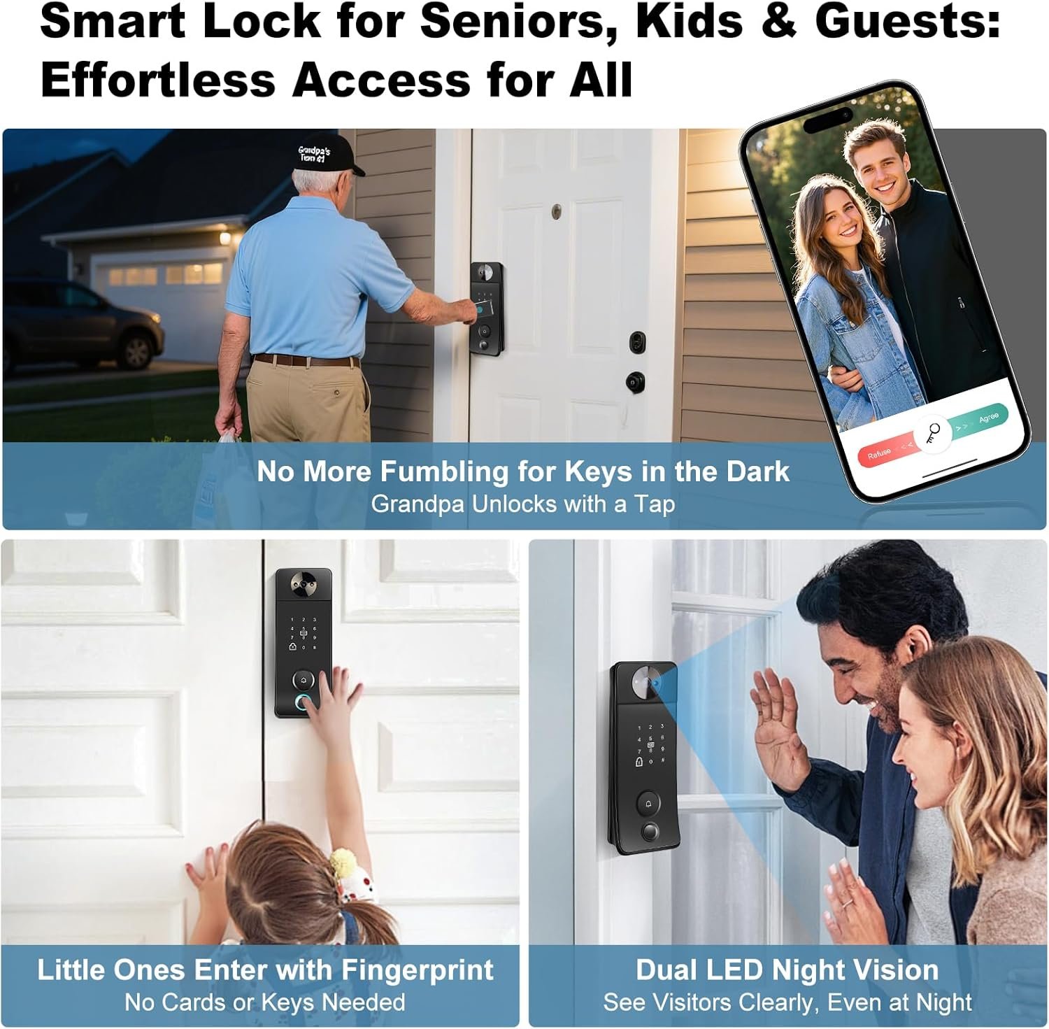 6 Unlocking Methods for the Whole Family: It covers all your needs: remote access via the Tuya App, storage for up to 100 fingerprints (easy for kids and elders), password entry, 2 included NFC cards, 2 mechanical keys, and temporary codes for guests. No more struggling with a single way to unlock