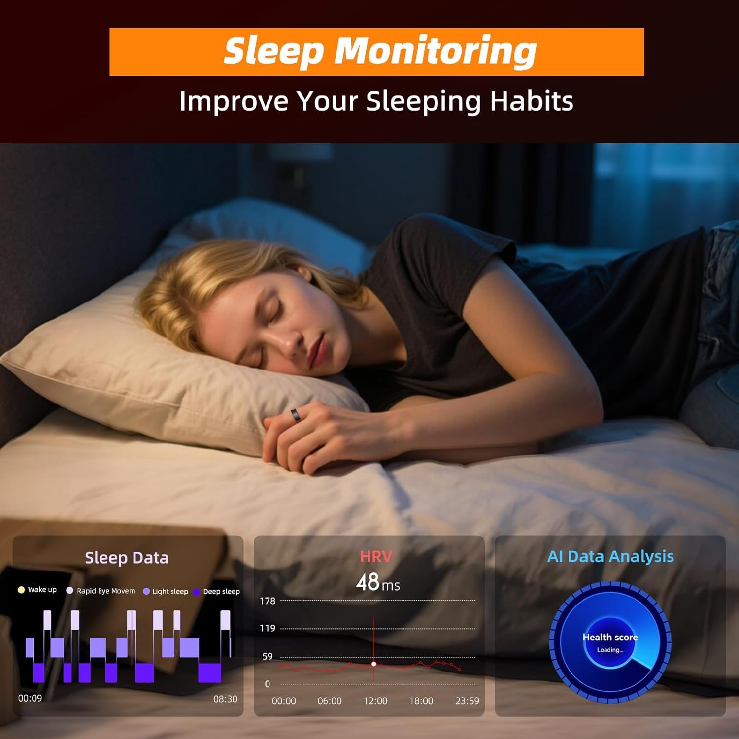 【Sleep Monitoring & AI Analysis】Sleep tracker ring provides accurate sleep tracking and monitors your sleep quality with detailed charts and data.Track your sleep data and sleep patterns throughout the night. With these detailed sleep data, APP also analyze daily, weekly and monthly reports to optimize your lifestyle and improve overall sleep