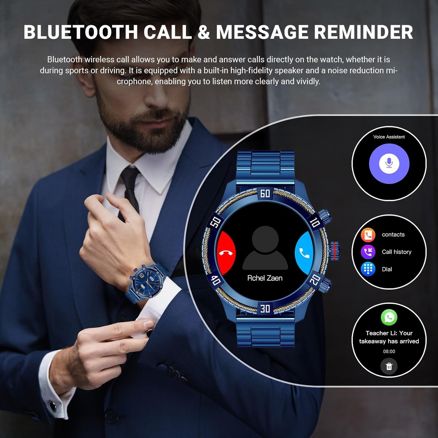 Smart watch luxury style with 2 Straps: Stylish smartwatch for men with a durable zinc alloy body, combining sophistication and versatility. Includes a stainless steel strap for business occasions and a silicone strap for active lifestyles. Easily swap straps in one minute