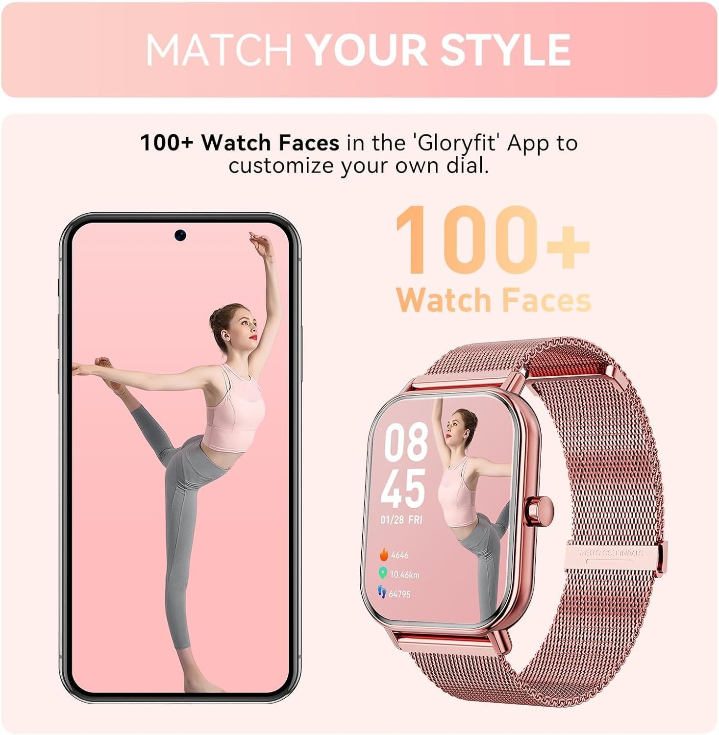 2 watch straps, 2 wearing styles: This smart watch for women men features a large screen design and comes with two interchangeable bands. The bright gold frame and gold stainless steel strap add a touch of elegance to any outfit. The smart watch for android phones offers a variety of built-in watch faces, or you can create your own personal photos. When paired with an iPhone, the Smart watch for iphone compatible allows you to use any photo, such as pictures of your family or pets.